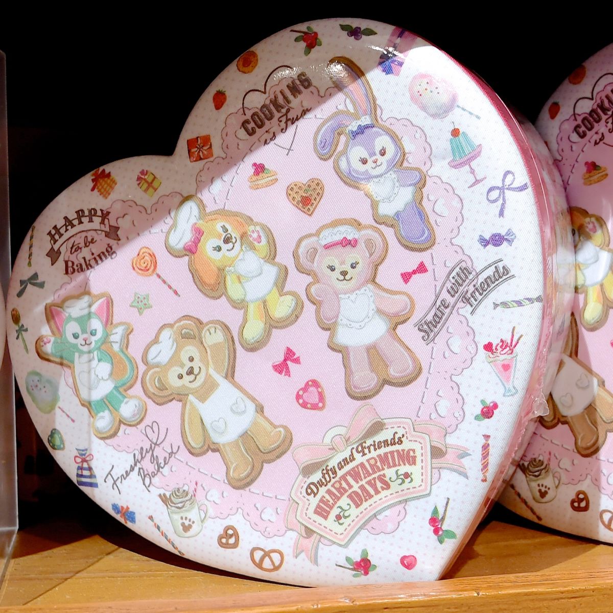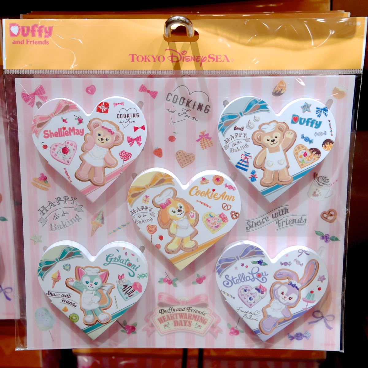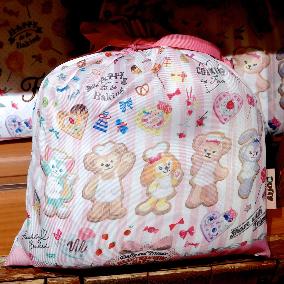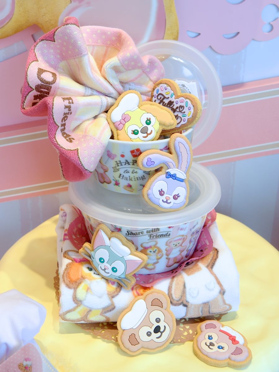 お菓子をつくるダッフィー、シェリーメイ、ジェラトーニ、ステラ・ルー、クッキー・アンが大きくデザインされています。