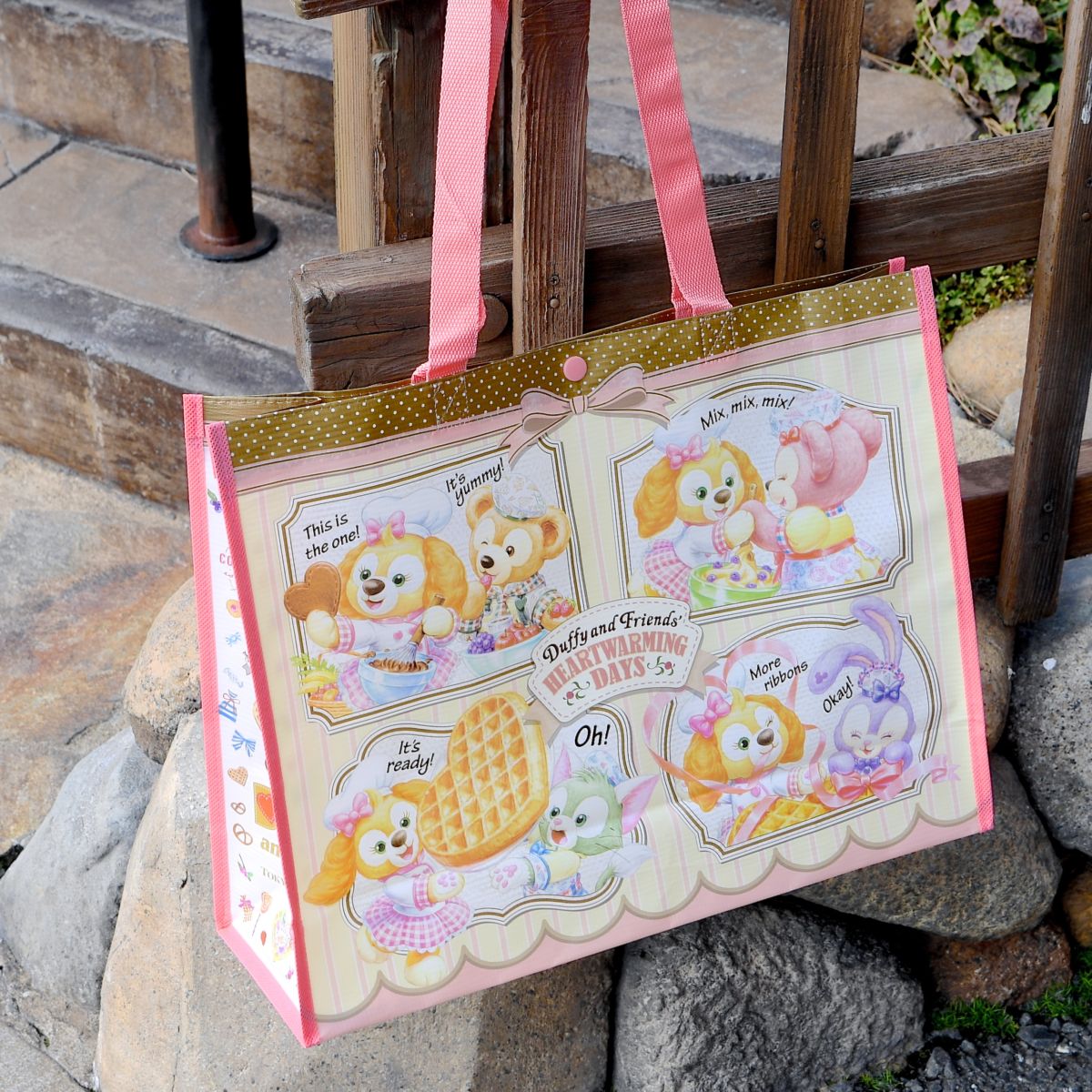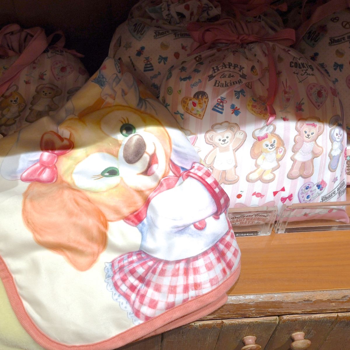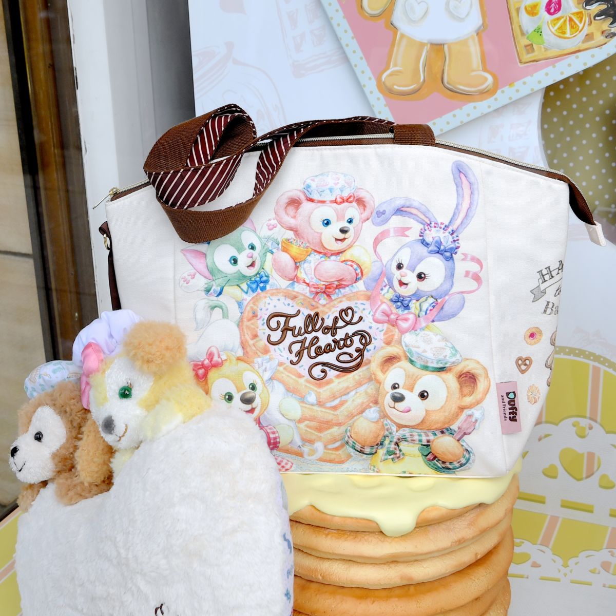 お菓子をつくるダッフィー、シェリーメイ、ジェラトーニ、ステラ・ルー、クッキー・アンが大きくデザインされています。