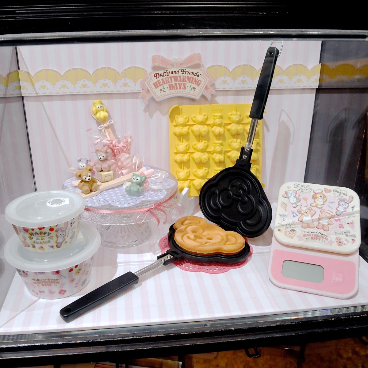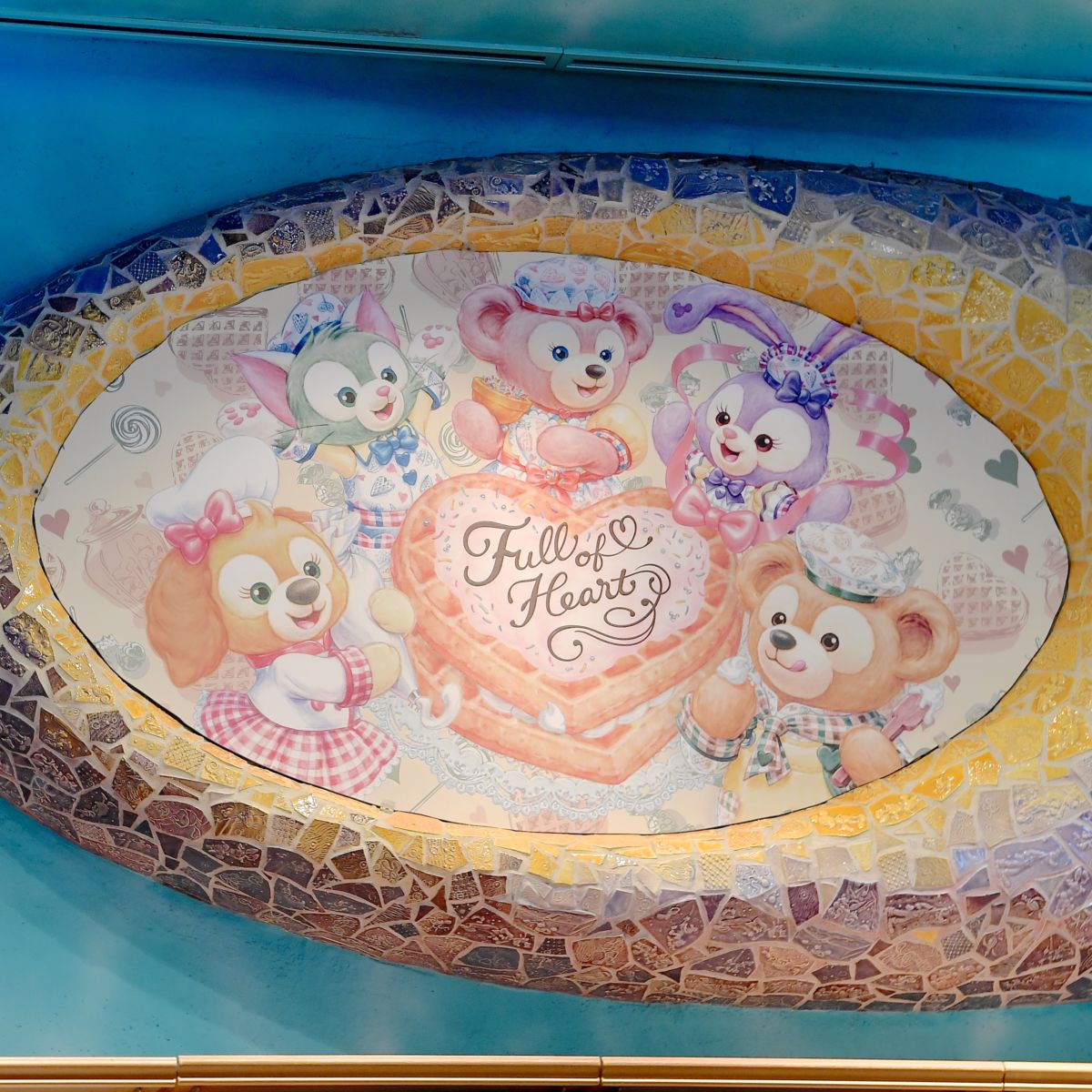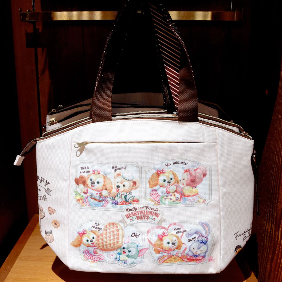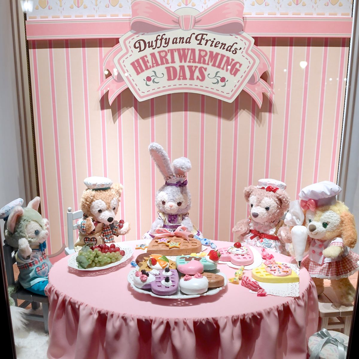 お菓子をつくるダッフィー、シェリーメイ、ジェラトーニ、ステラ・ルー、クッキー・アンが大きくデザインされています。