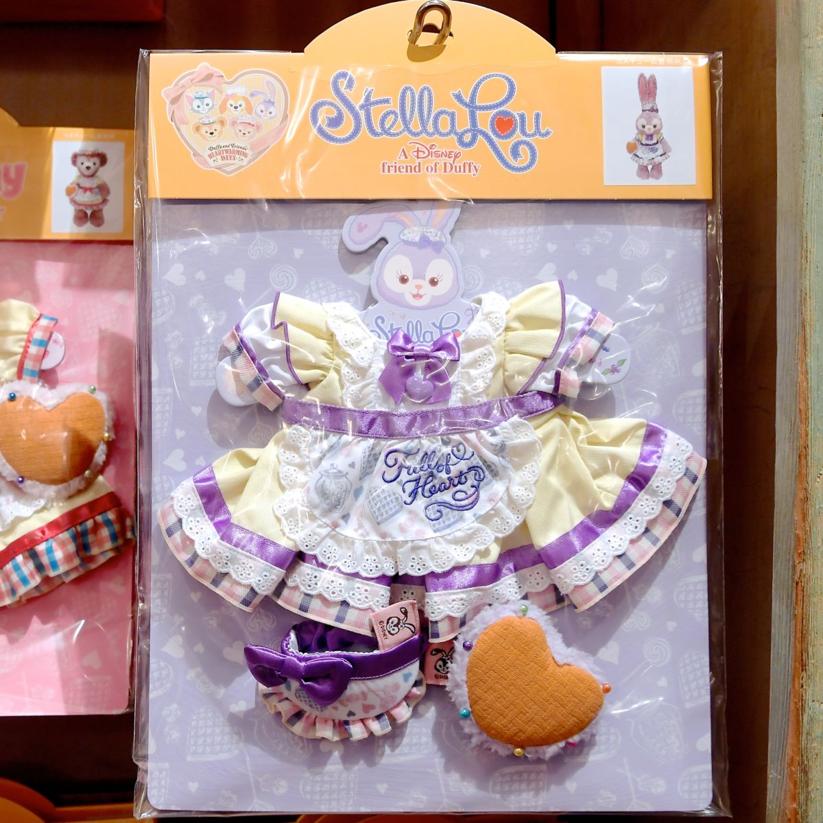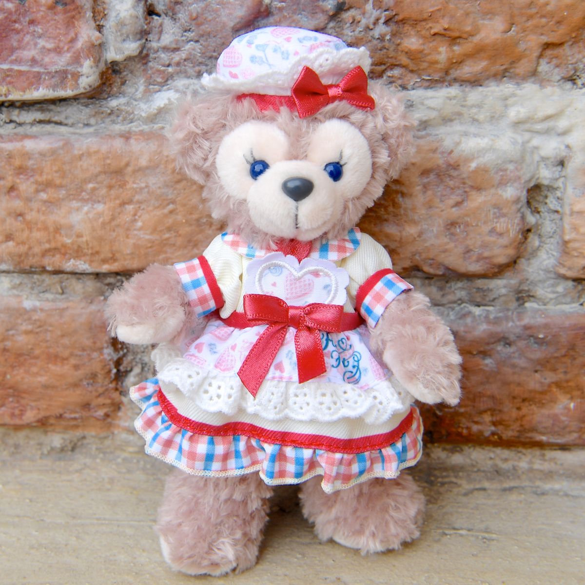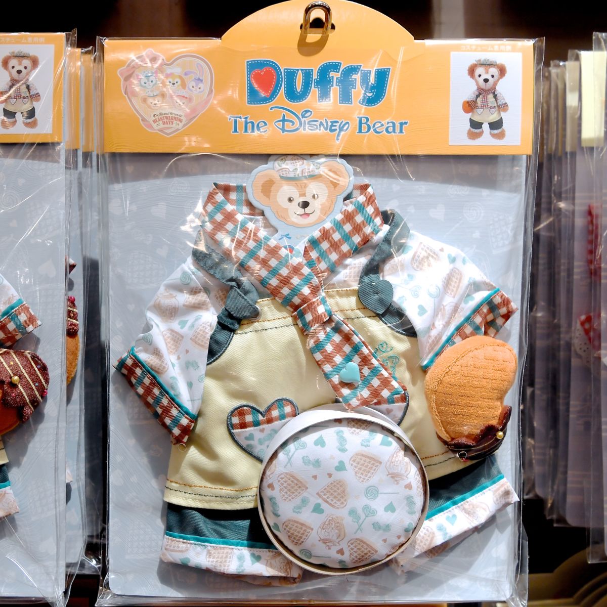 ダッフィーはかわいいチェック柄のスカーフやシャツにエプロンをつけています。
