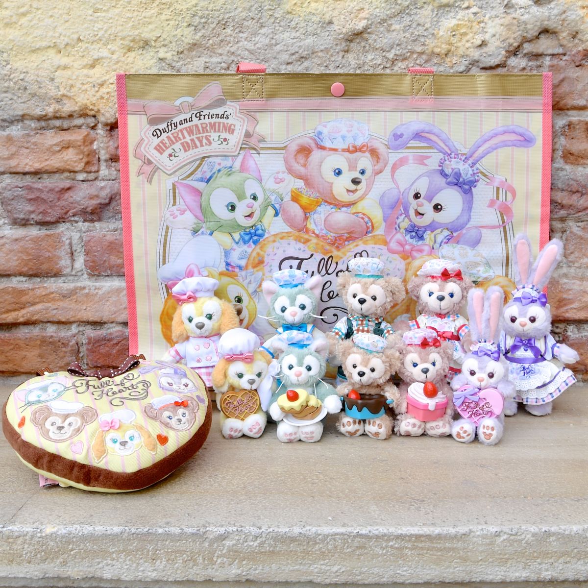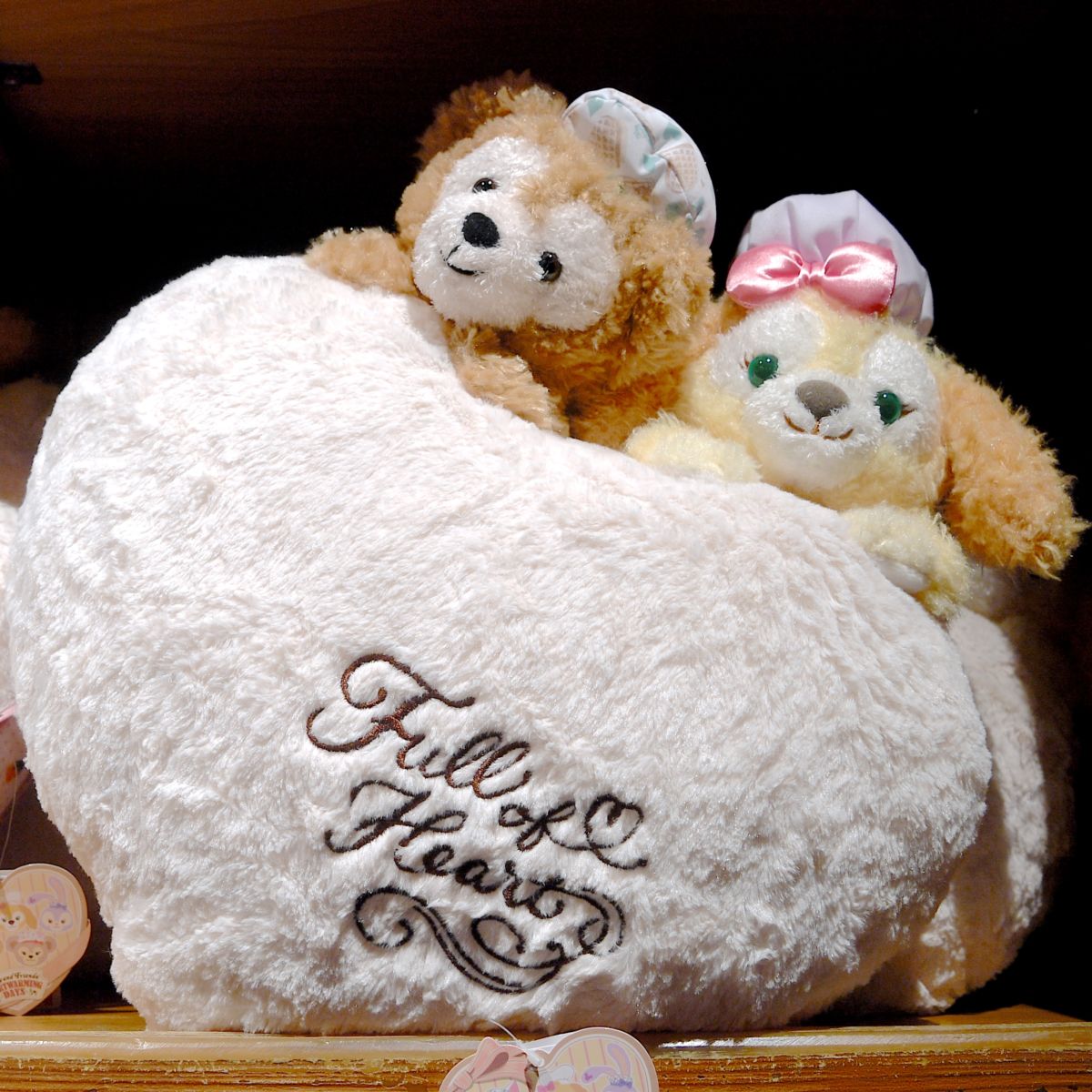 ダッフィー、クッキー・アンのぬいぐるみ付きふわふわハートクッション。