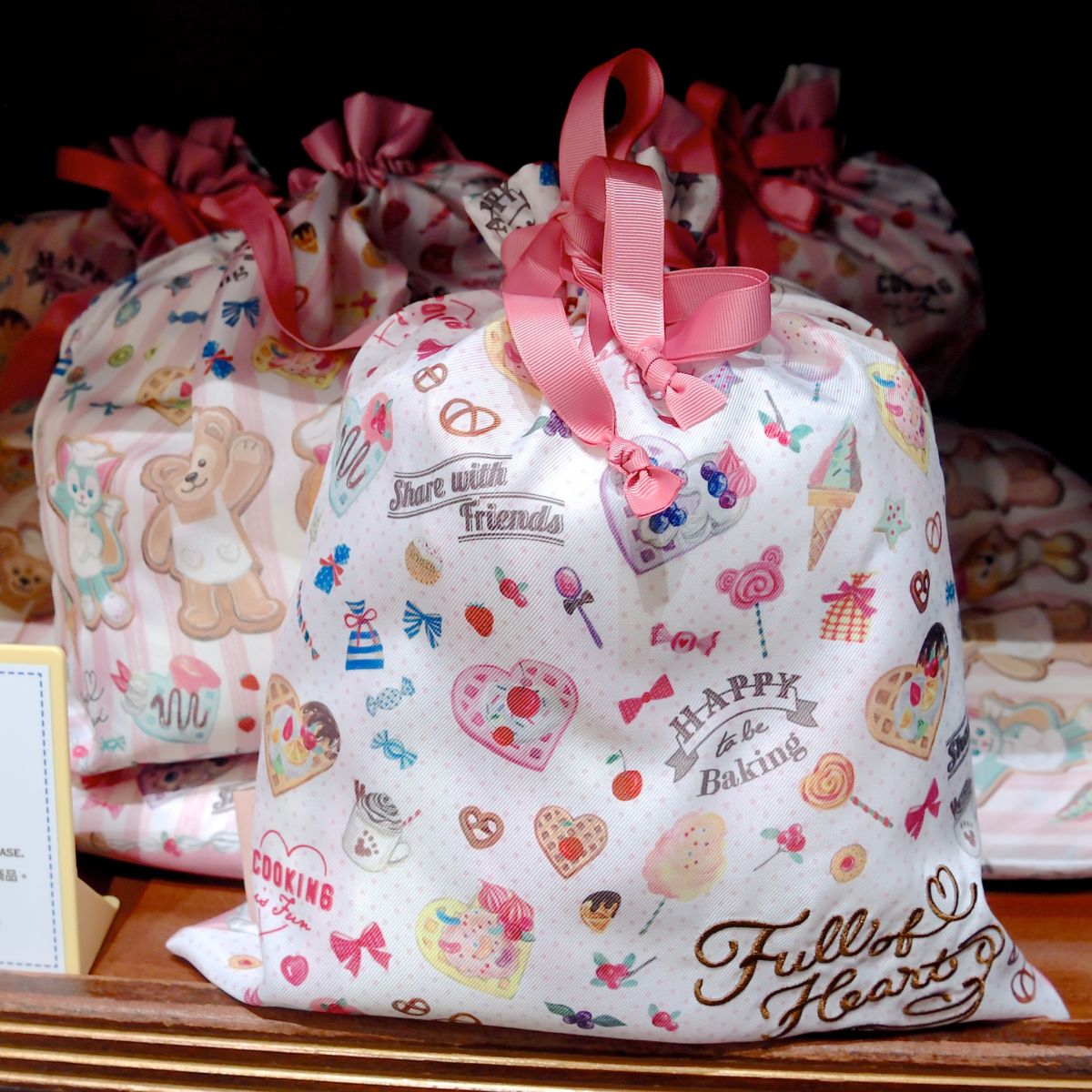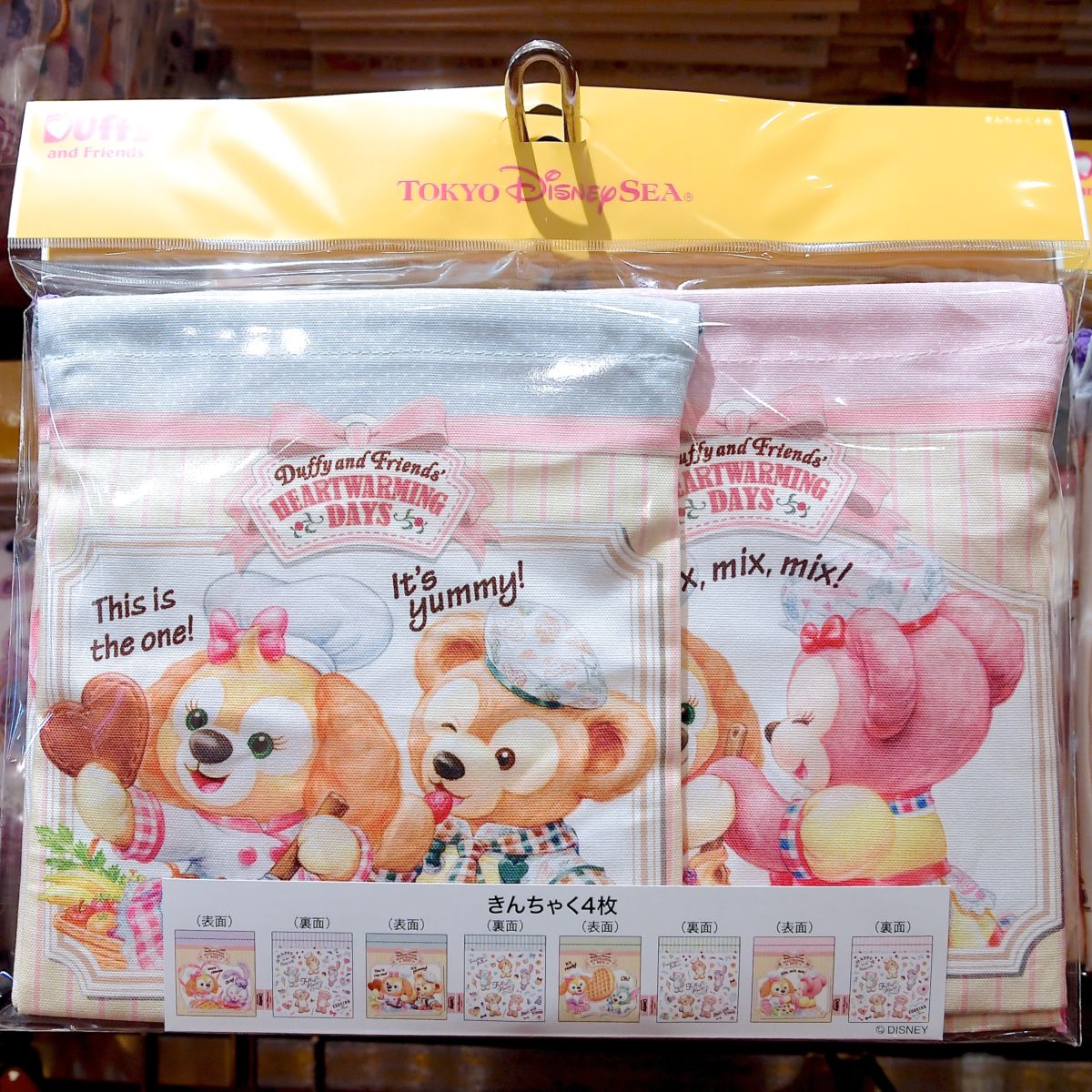 ワッフルをつくるクッキー・アンとダッフィーたちがデザインされた巾着4枚セット。