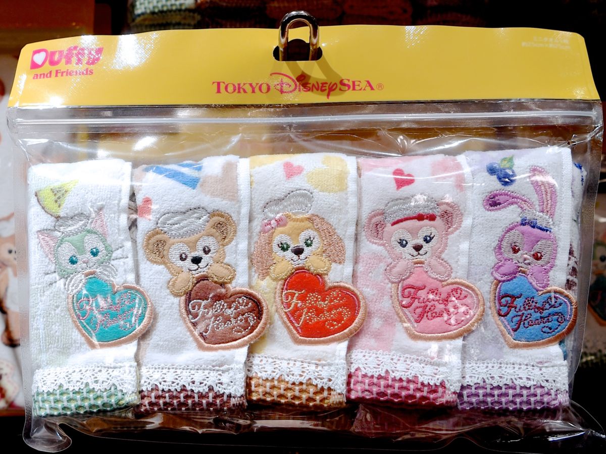 ワッフルやスウィーツ、ダッフィーたちがデザインされたミニタオル5枚セット。