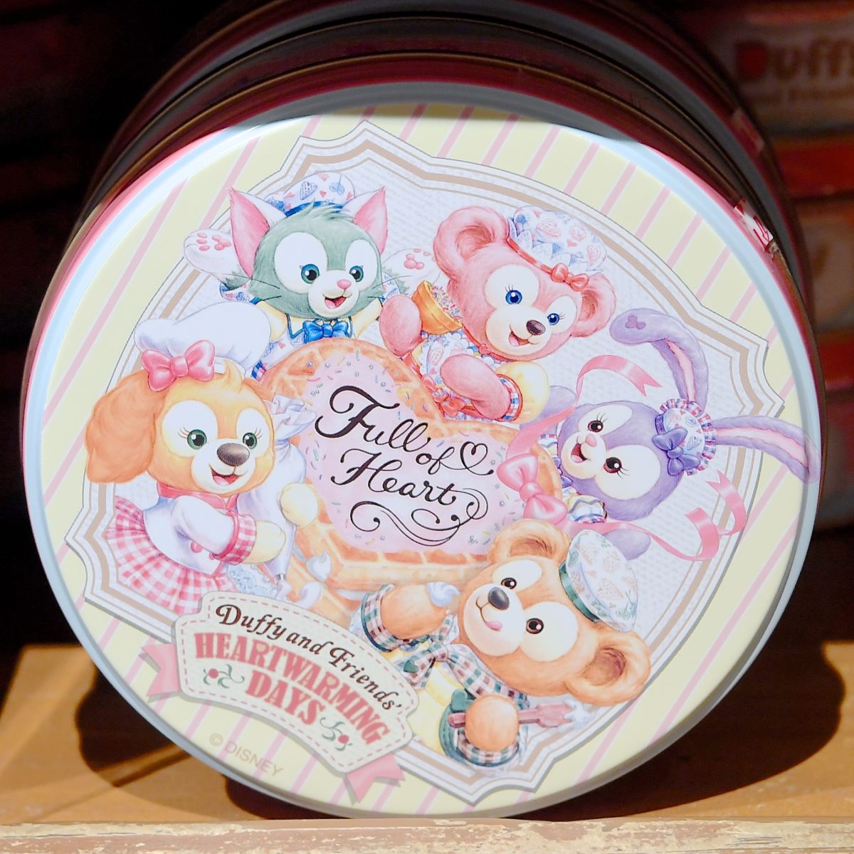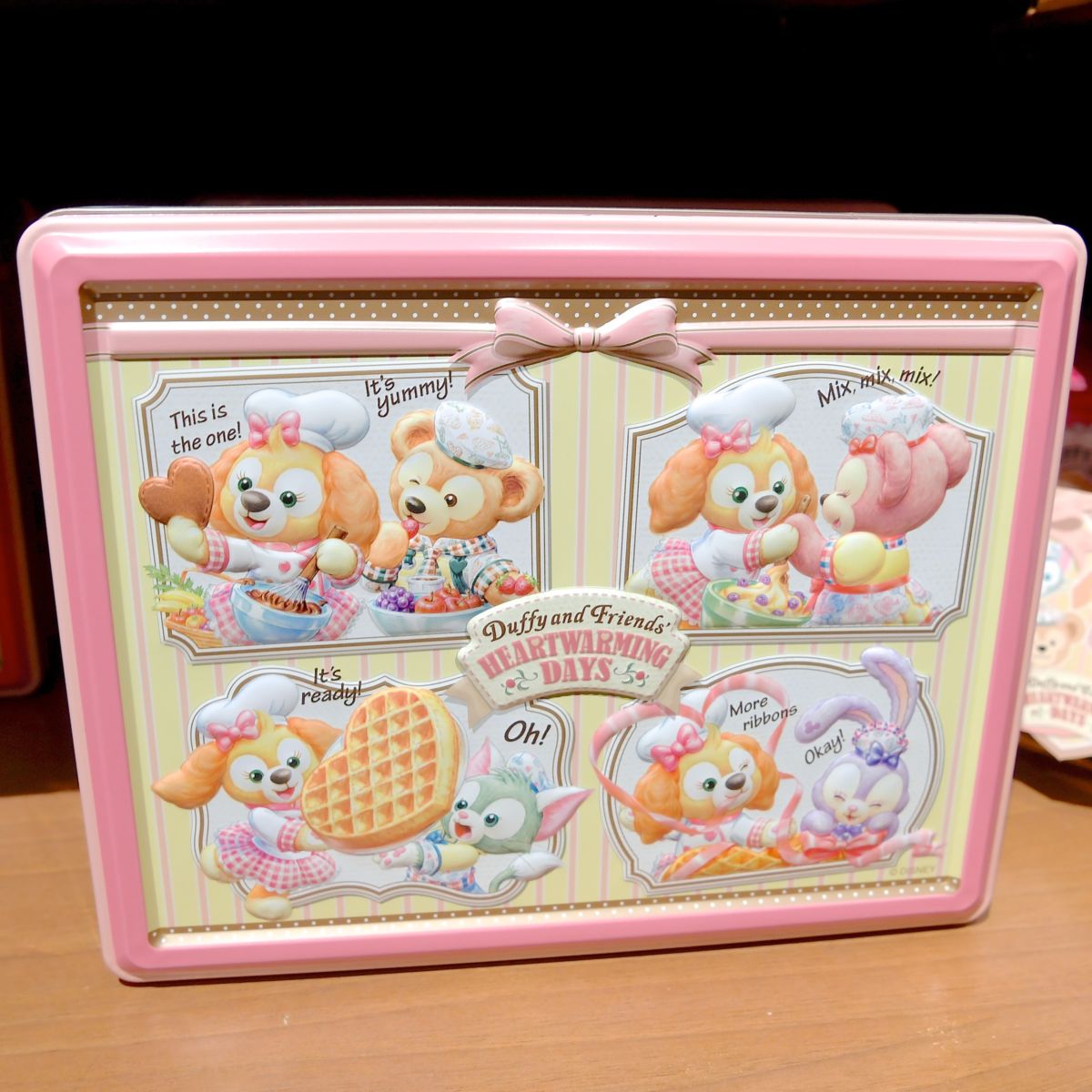ハート型のワッフルを作るダッフィー&フレンズがデザインされた缶入りのチョコレートのお土産。