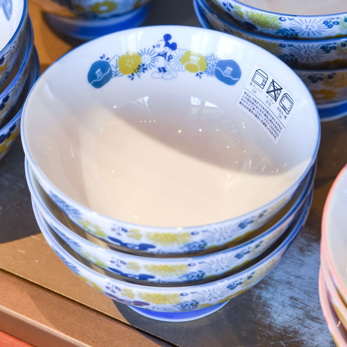 クラシックなミッキーマウス、イヤーハット、パークの風景などデザインされたブルーベースのお茶碗。