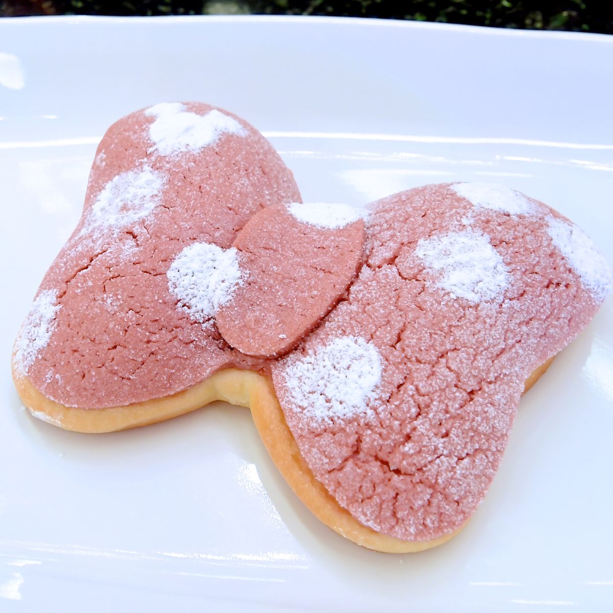 ピンク色のクッキー生地には、白のドット柄に粉砂糖がかけられています。