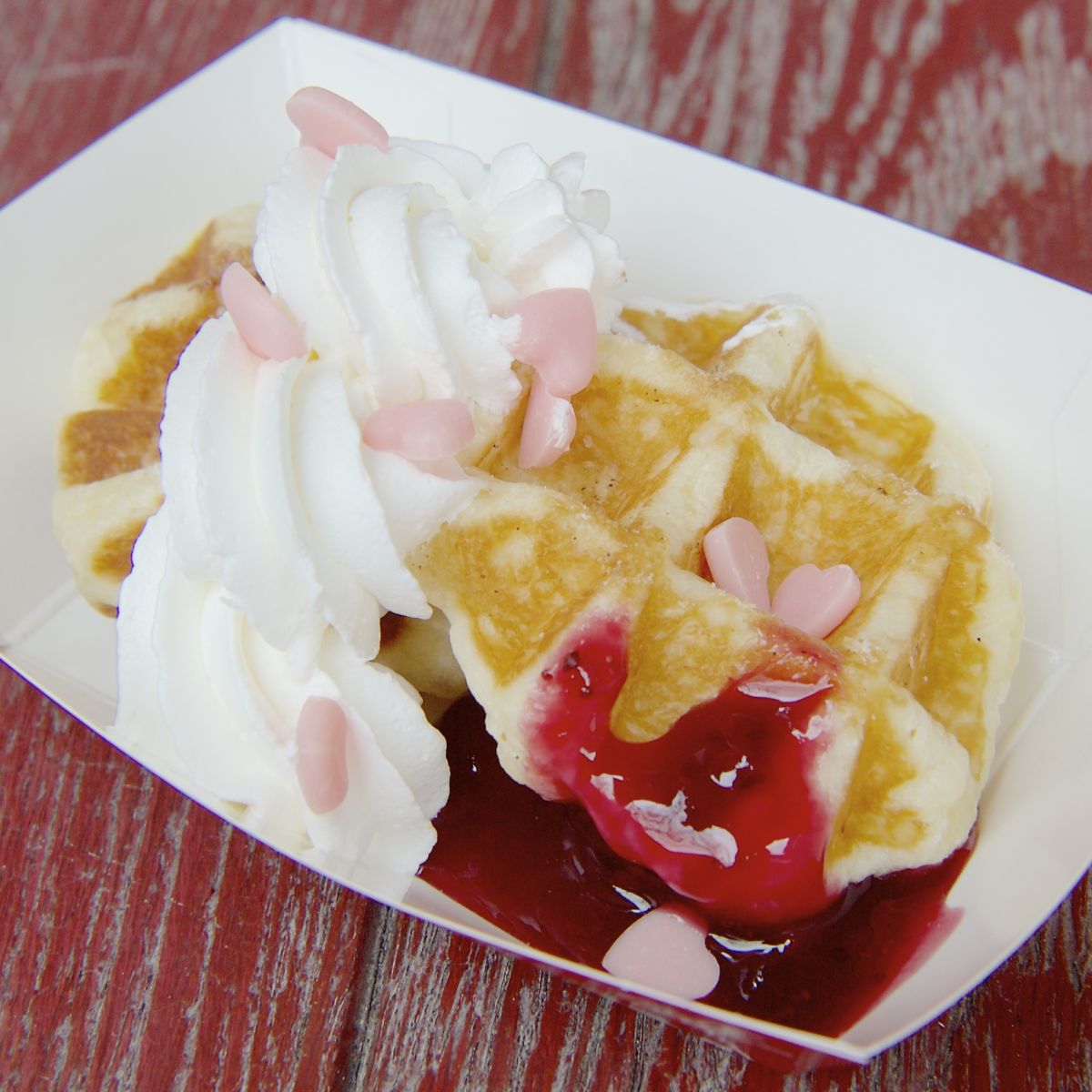 デザートのワッフルには、ホイップクリームと、相性抜群のミックスベリーソースが添えられています。