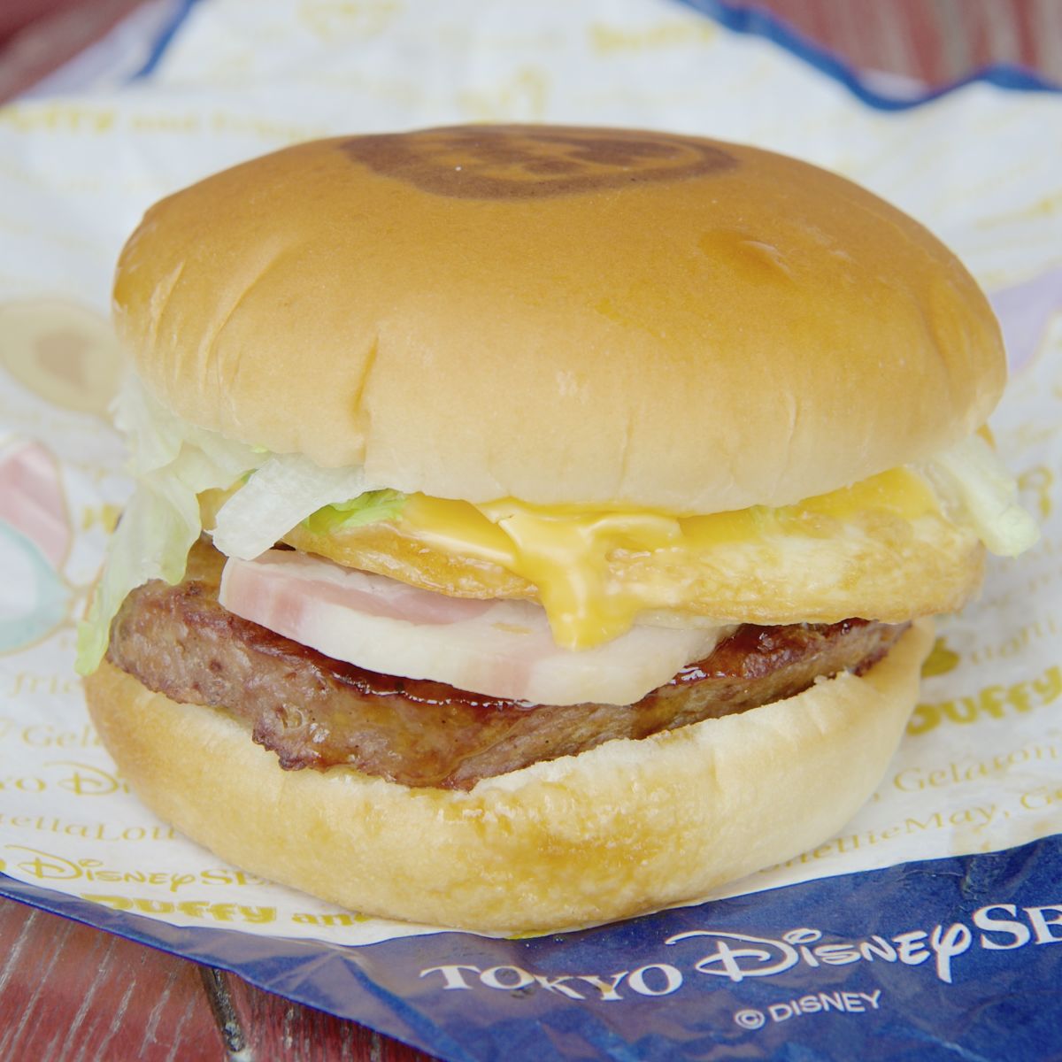 ダッフィーの足型の焼印がついたパンズにサンドされたベーコンエッグチーズバーガー。