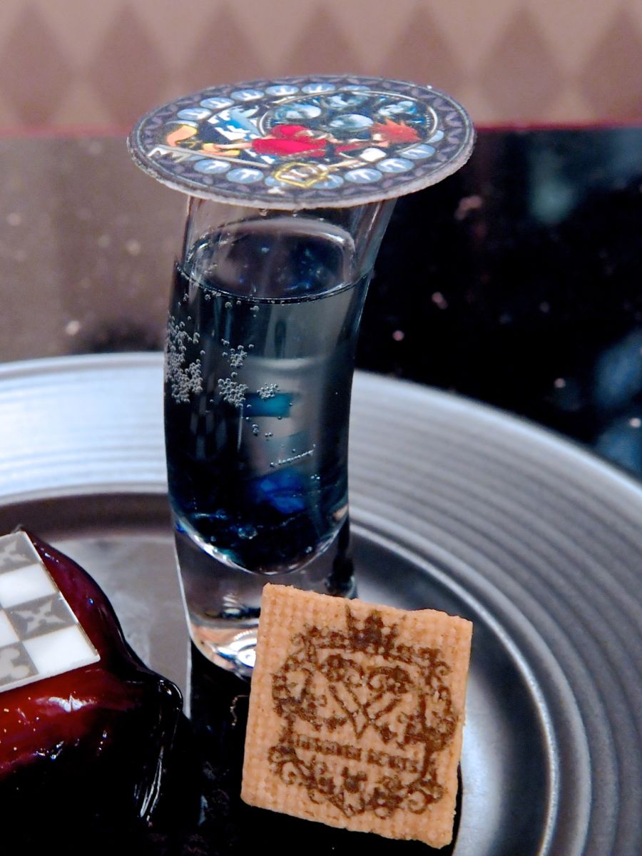 ステンドグラスがデコレーションされた、「キングダム ハーツIII」のキーアートをイメージしたグラスデザートも添えられています。