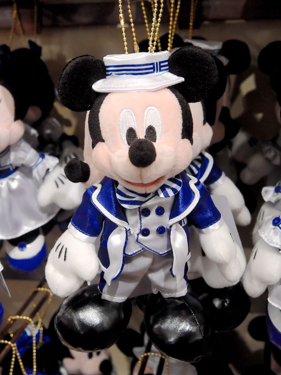 アールデコなホテルの雰囲気にあった爽やかな青と白のコスチューム姿のミッキーマウスぬいぐるみバッジ。