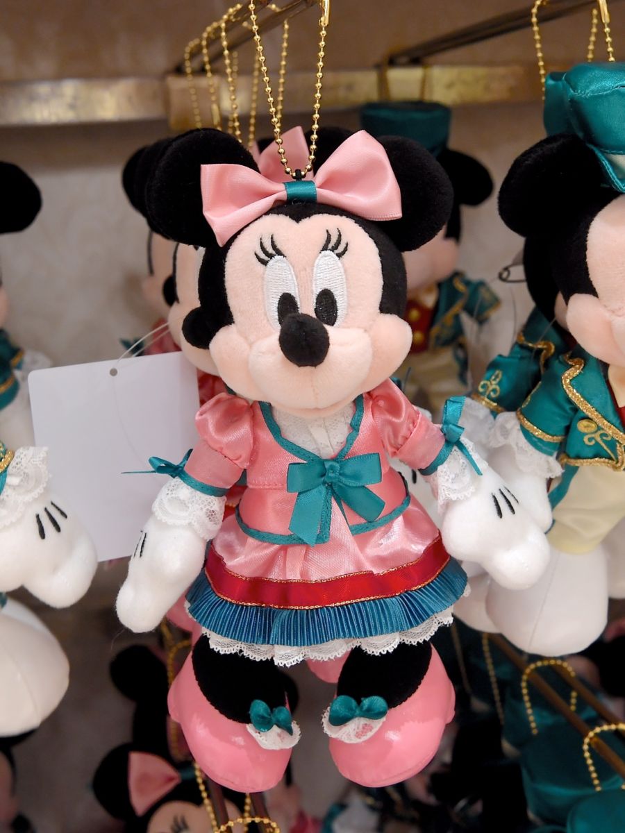 ミニーマウスもシックな帽子に豪華なピンク色のドレス姿です。