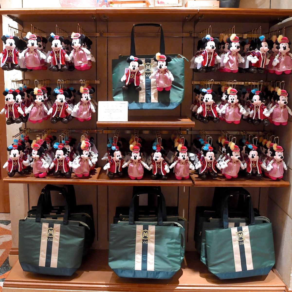 ホテルオリジナルのコスチュームを着たミッキーマウスとミニーマウスのぬいぐるみバッジ付きのトートバッグが登場しました。