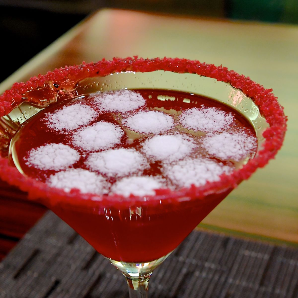 クランベリージュース、ブラッドオレンジシロップ、ストロベリーピュレシロップ、ストロベリーシロップ、ドライラズベリー、アイシングシュガーで作られた甘くて美味しいドリンクメニュー!