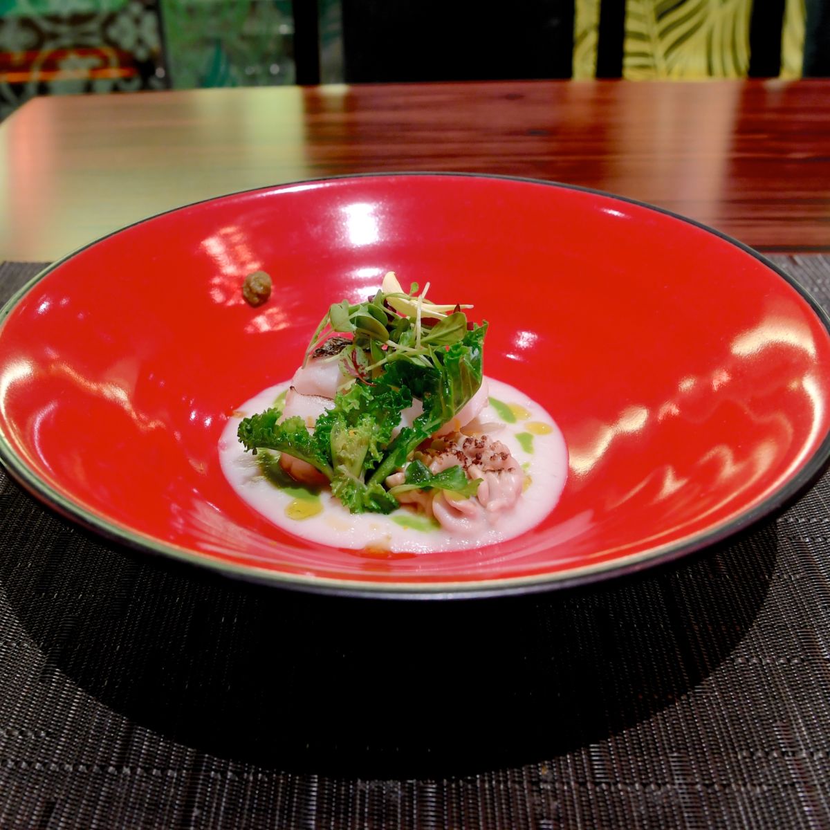 大きさやテイストの異なるドット柄がデザインされた華やかな前菜。