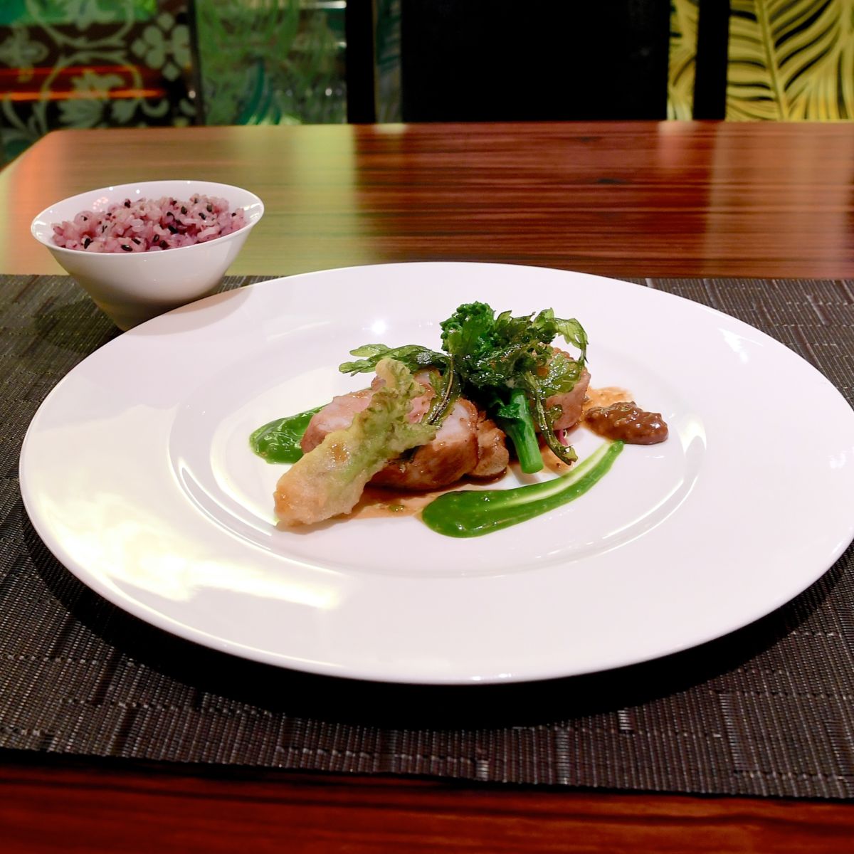 ポークのロースト ジュニエーブル香る紫キャベツマリネ 菜の花とホースラディッシュのクーリー
