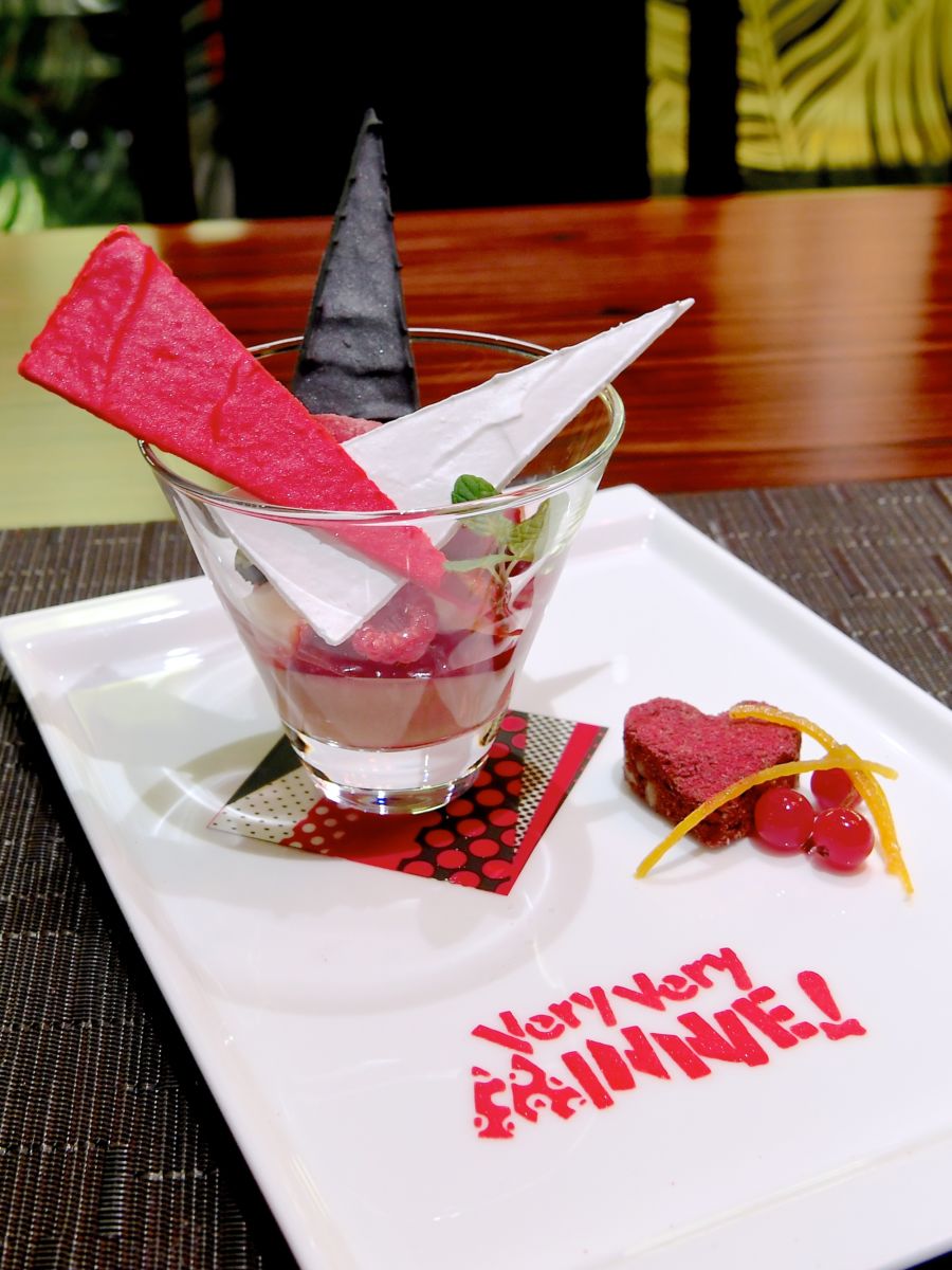 チョコレートゼリーやストロベリームース、ラズベリーのソルベ、バシュランメレンゲが層になったグラスデザート。