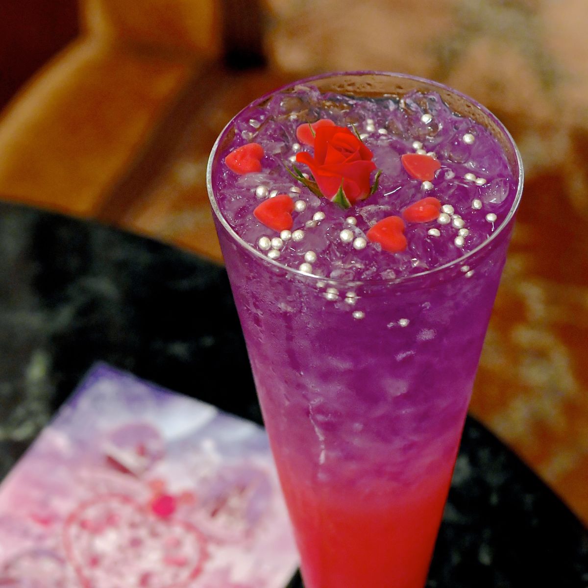 クランベリージュース、カルピス、ストロベリーシロップ、バタフライピーシロップ、レモンシロップ、クラブソーダ、チョコレート、ベルローズ、アラザン入りの爽やかなスペシャルドリンク。