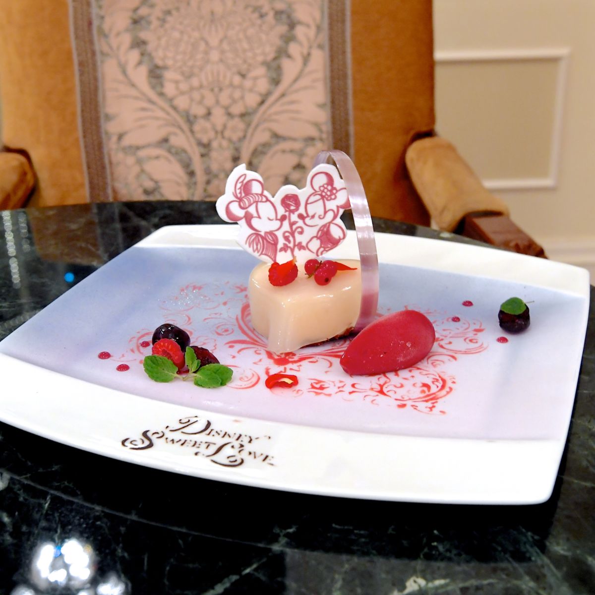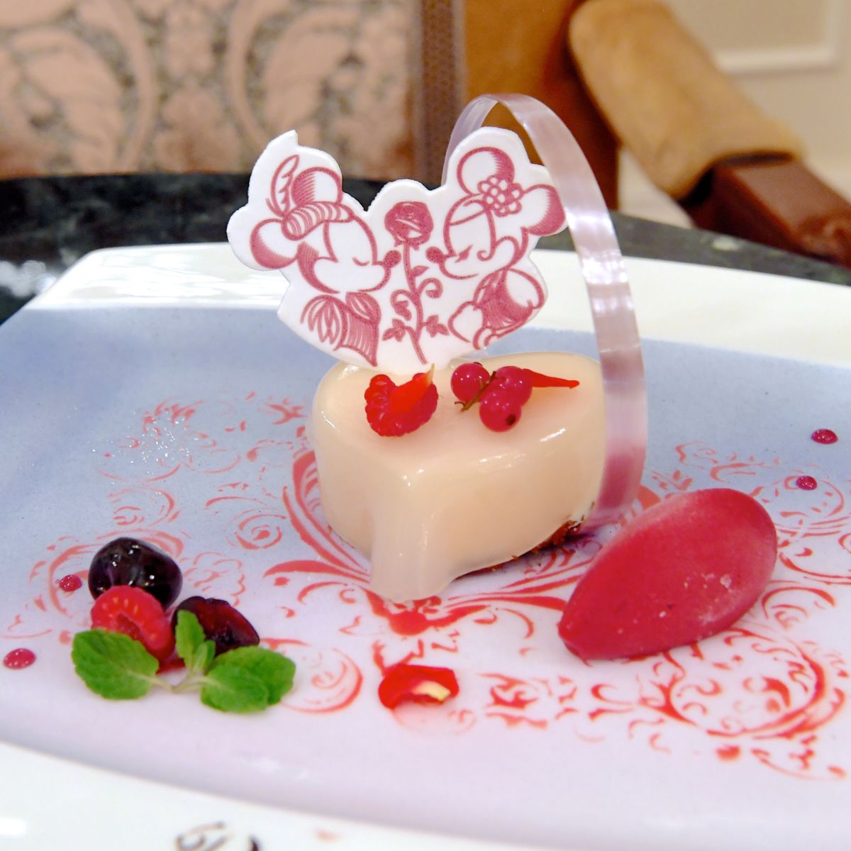 デザートプレートは、飴細工とミッキーマウス、ミニーマウスのデコレーションが素敵なホワイトチョコレートムース、ラズベリーアイス添え。