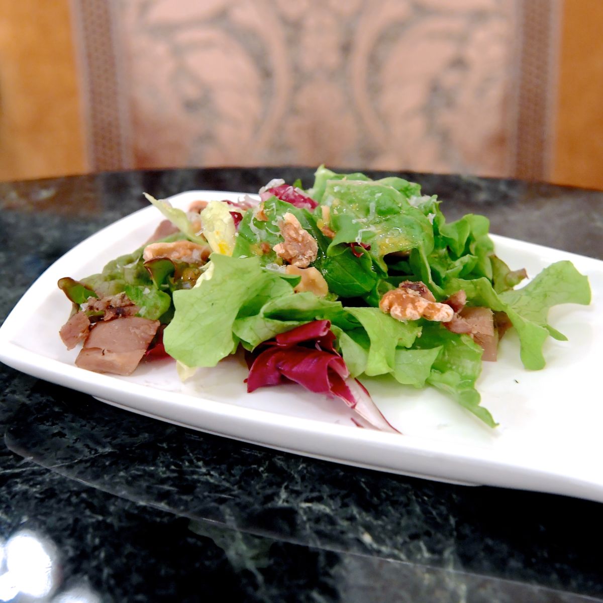 鴨コンフィ、くるみ、チーズが入ったサラダはオレンジソースでさっぱりといただきます。