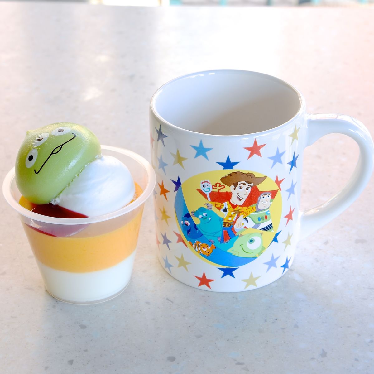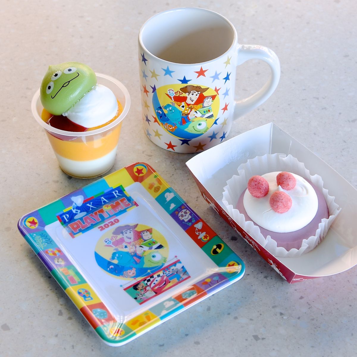 ディズニー/ピクサー映画の仲間たちがデザインされたスーベニアグッズ付きデザート2種。