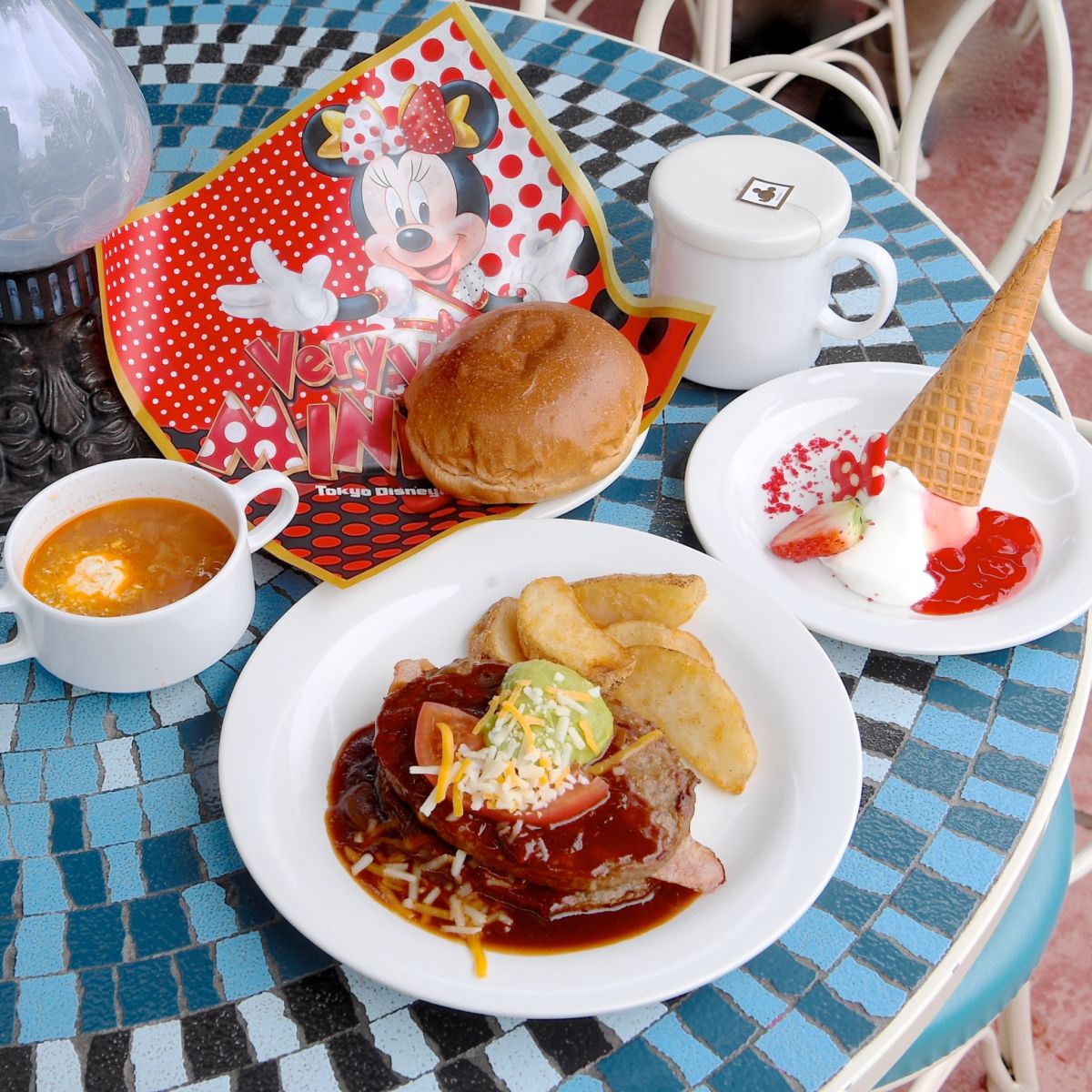 東京ディズニーランド/ウエスタンランドにある洋食レストラン「プラザパビリオン・レストラン」で提供されている“ベリー・ベリー・ミニー!”スペシャルセット。