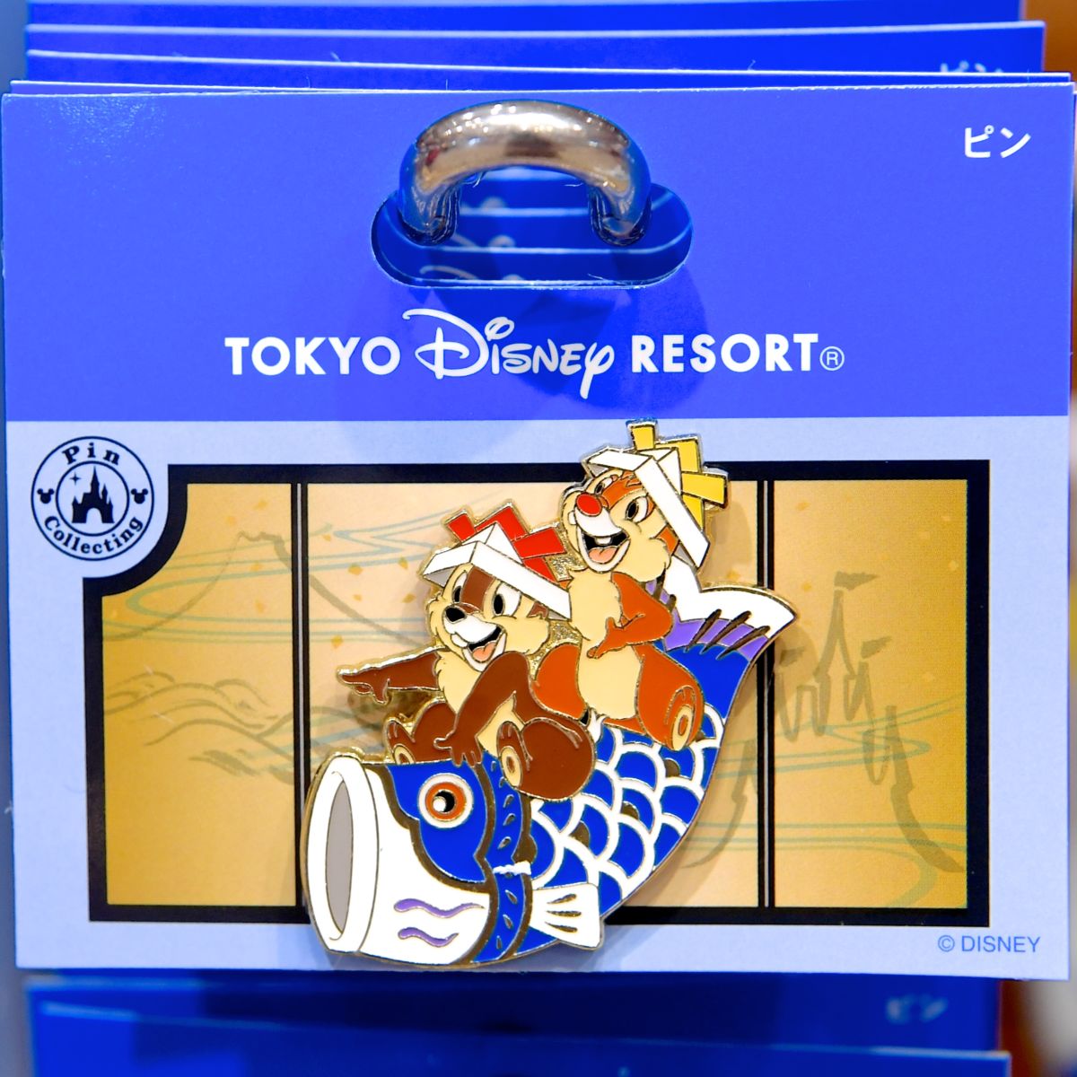 兜をかぶって鯉のぼりに乗るチップ&デールがかわいいピンバッジ。