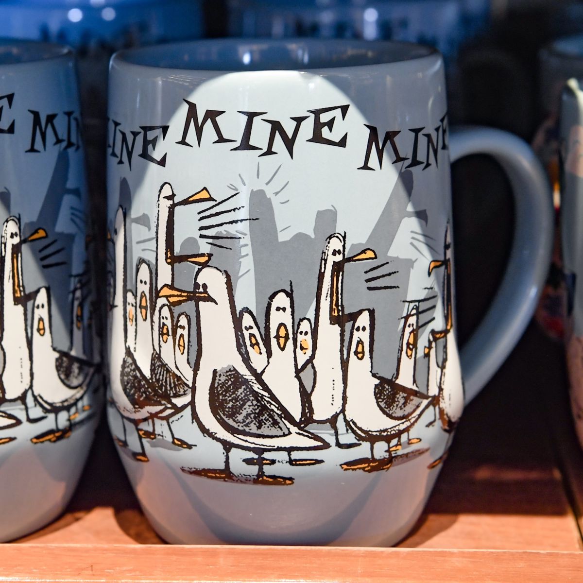 集まってこちらをみているようなカモメたちとMINEMINEの文字が描かれた青色と