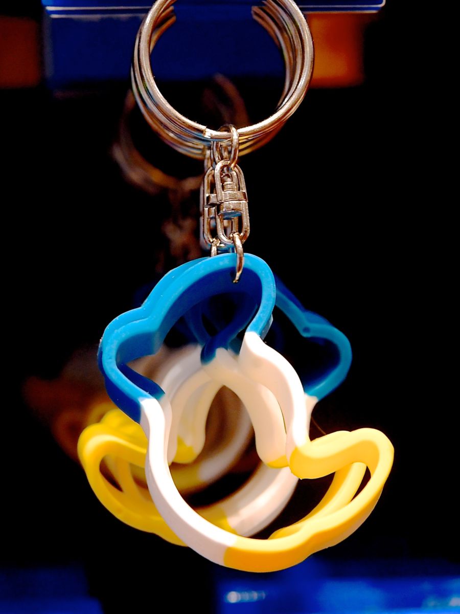 ドナルドダックの横顔シルエットが青、白、黄色のドナルドカラーでデザインされたキーチェーン。