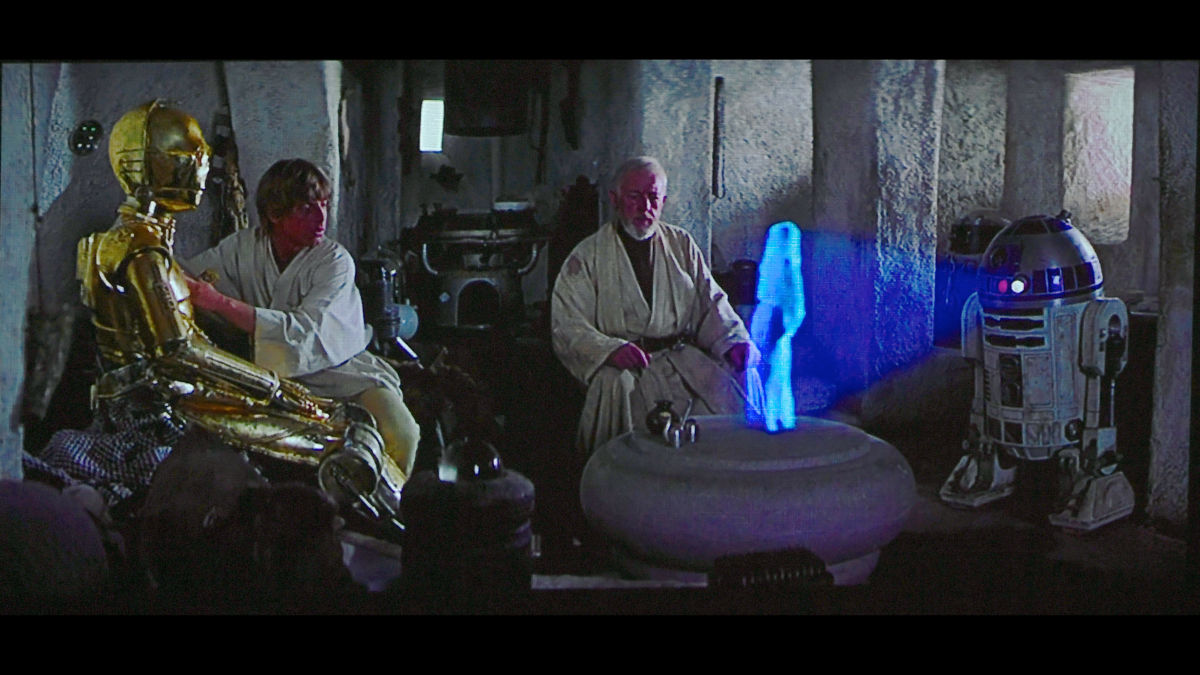 『スター・ウォーズ エピソード4/新たなる希望』の冒頭で「R2-D2」がオビ=ワン・ケノービにレイア姫のメッセージを届けるシーンを彷彿とさせます。