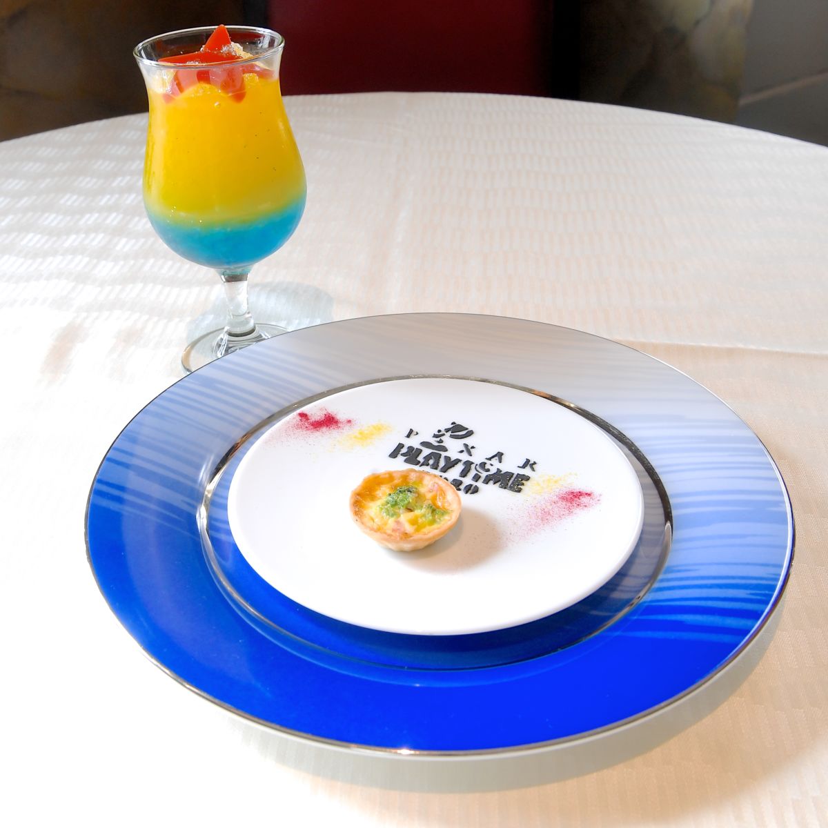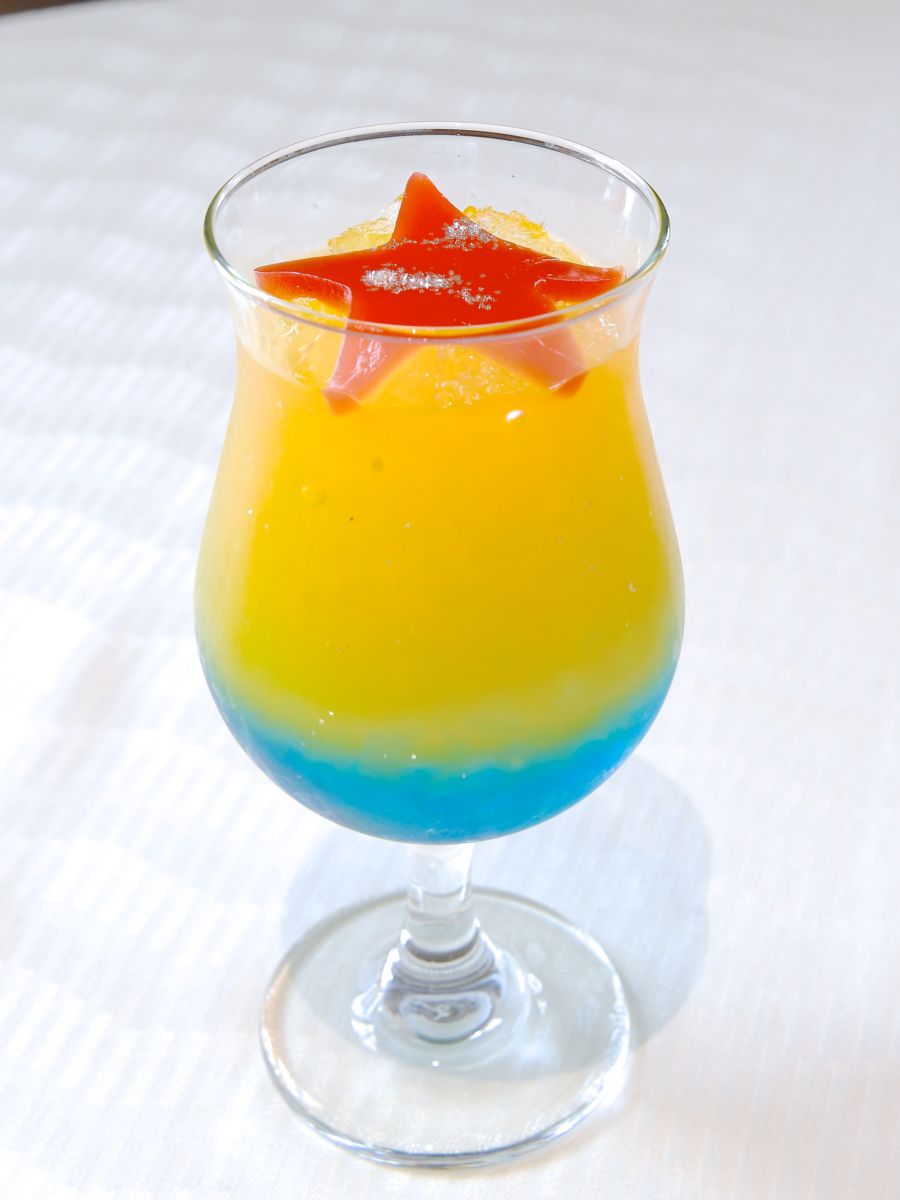 和歌山産 温州みかんジュース、エルダーフラワーシロップ、ブルーシロップ、レモンジュース入りのスペシャルドリンク。