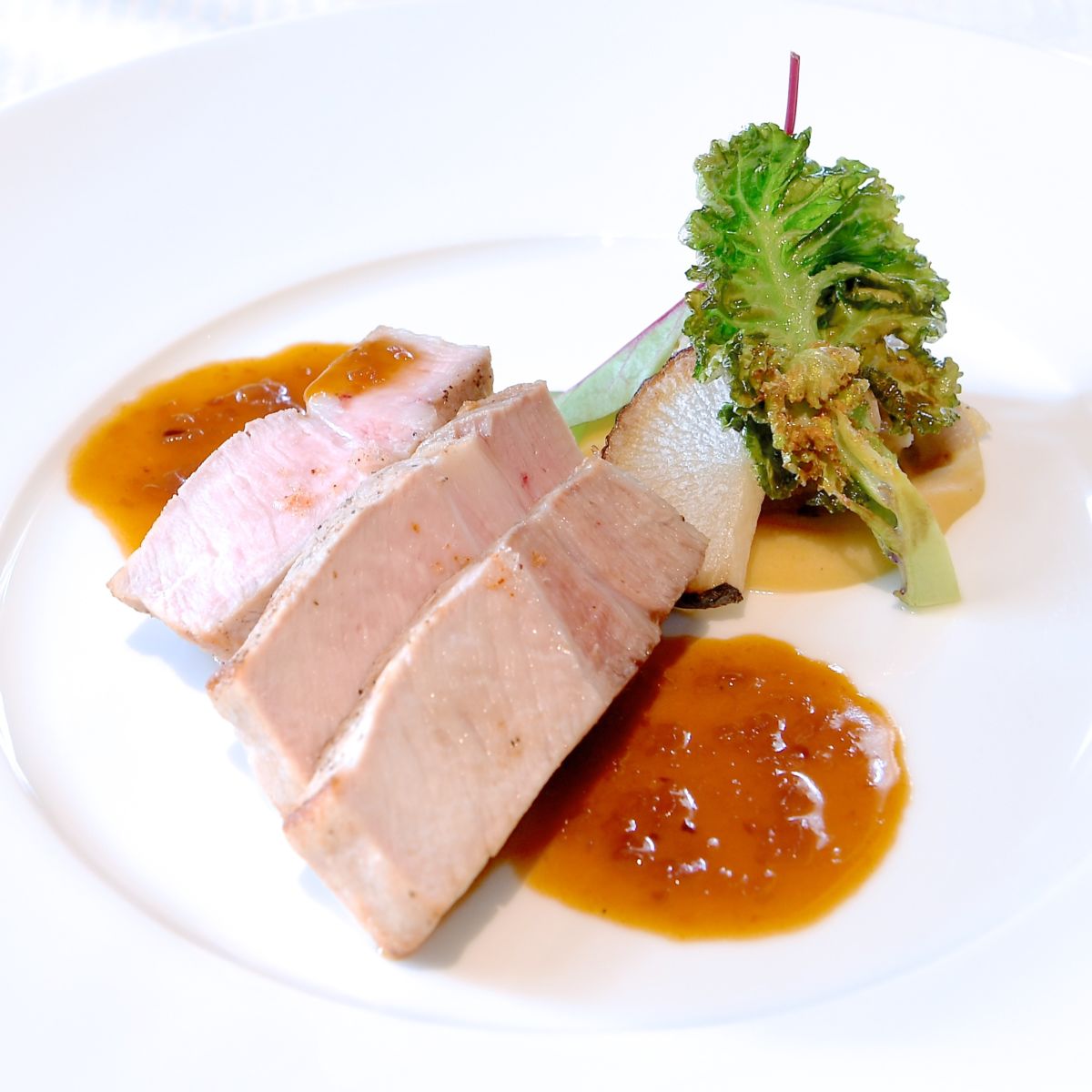 ポークロインのロースト エシャロットソース 西洋牛蒡のリヨネーズ仕立て