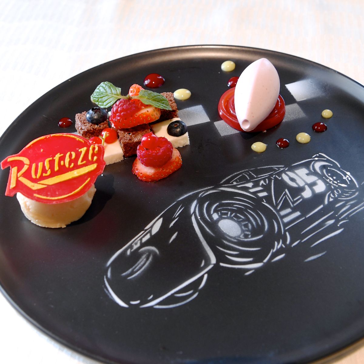 デザートはライトニング・マックィーンが大きくデザインされた格好いいプレートで登場!