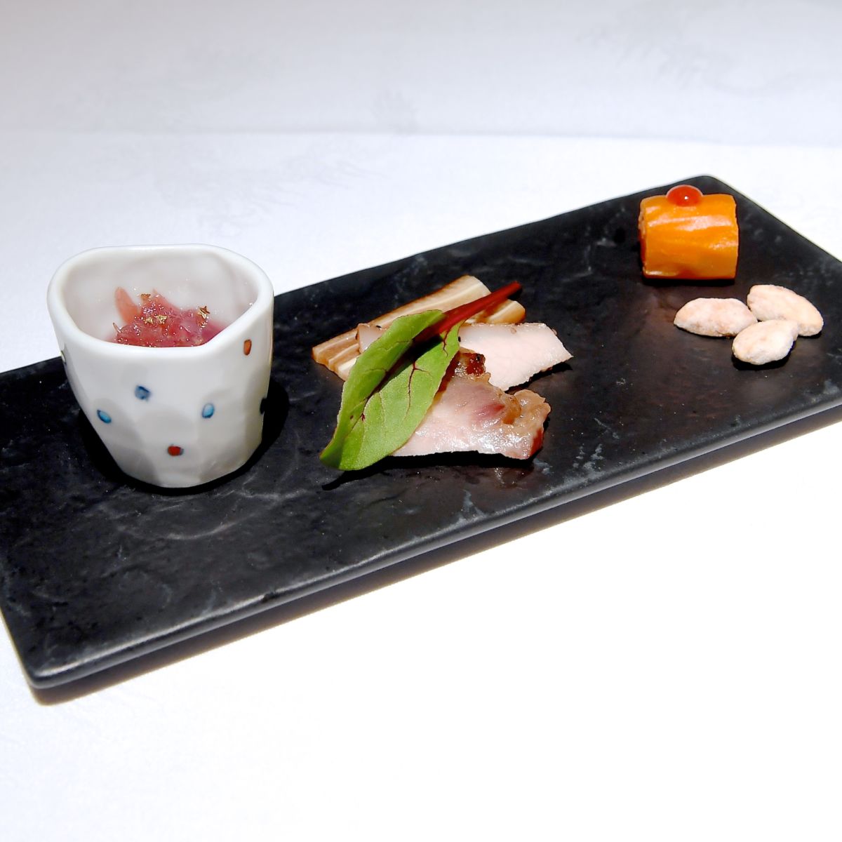 前菜は、ビーツで色付けされたクラゲ、チャーシュー、豚トロ、ミミガー、ナッツ、野菜の甘酢漬け。