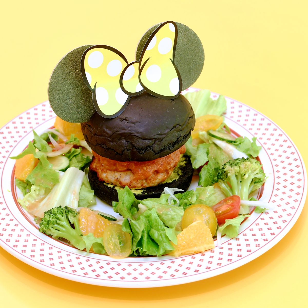 リボンを付けたかわいいミニーマウスのシルエット型のハンバーガー。