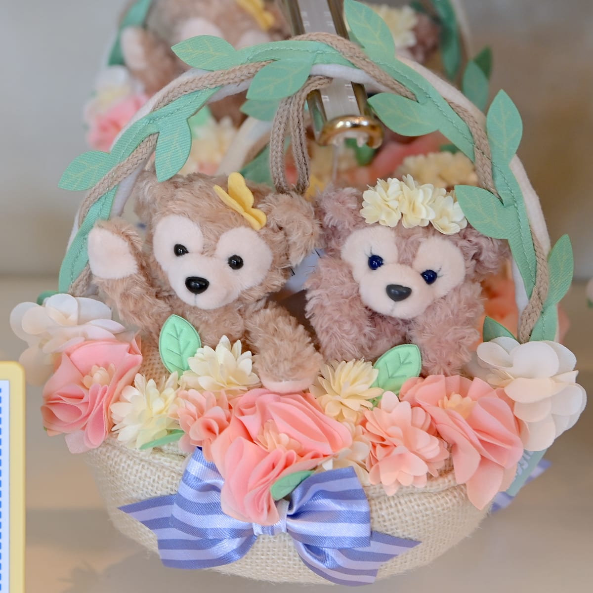 お花摘みのかごに入ったダッフィーとシェリーメイがかわいいリース。