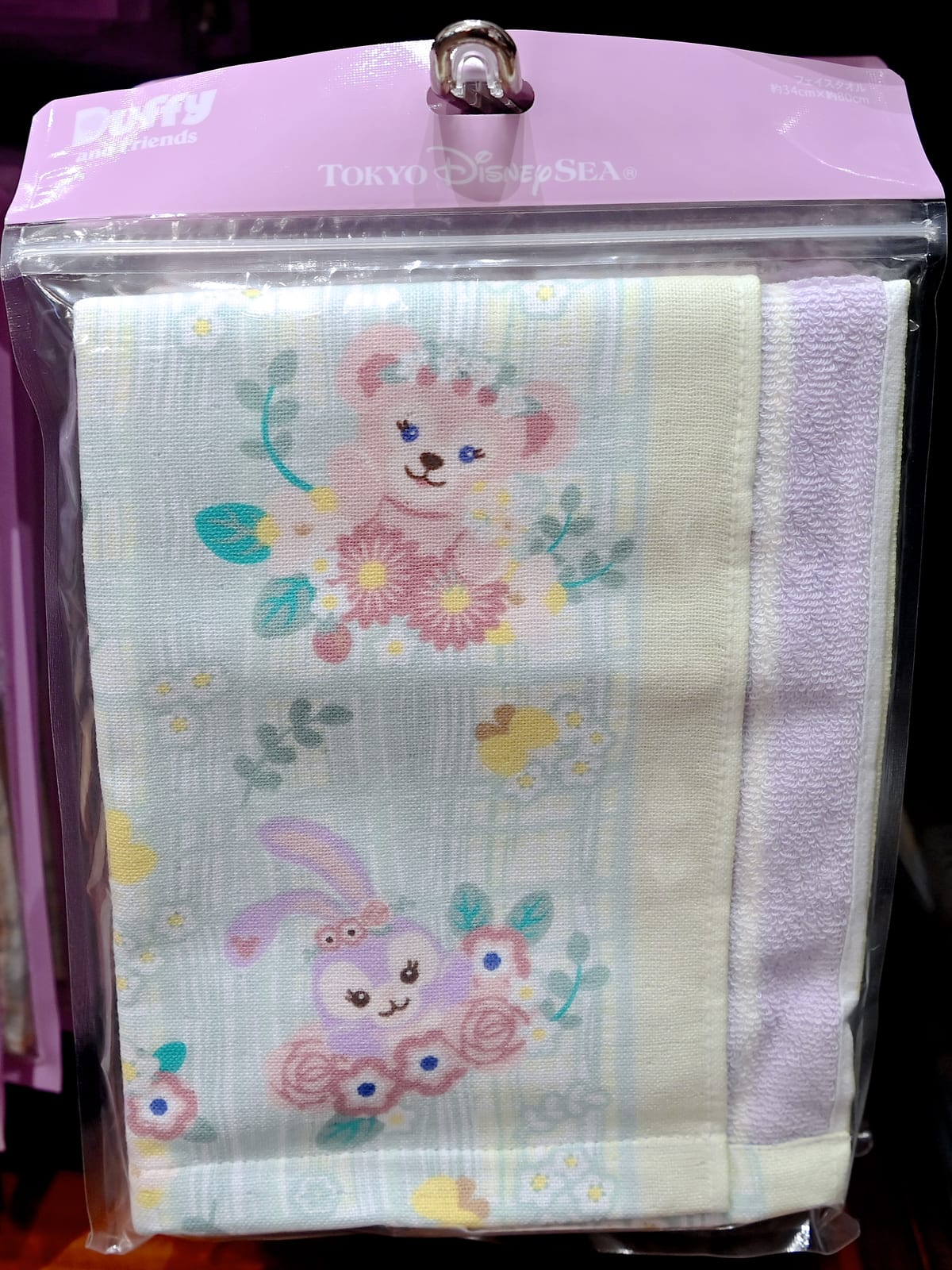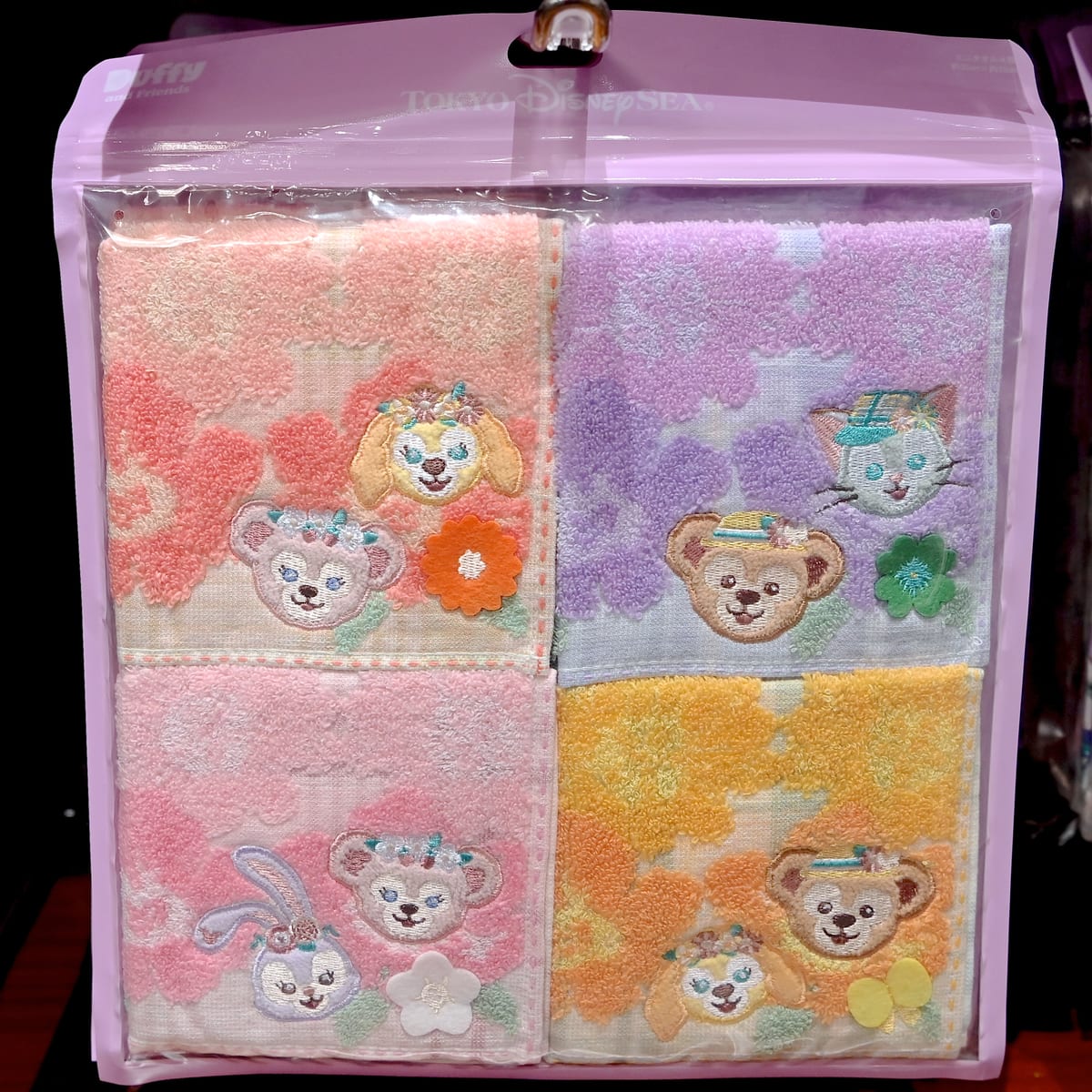 ダッフィー&ジェラトーニ、シェリーメイ&ステラ・ルー、ダッフィー&クッキー・アン、シェリーメイ&クッキー・アンデザインのカラフルなミニタオル4枚セット。