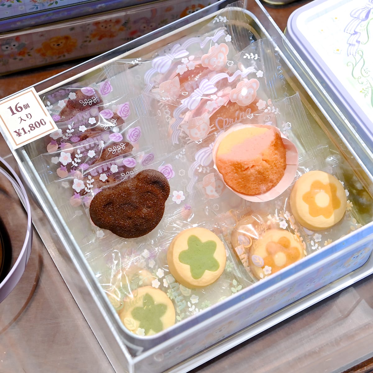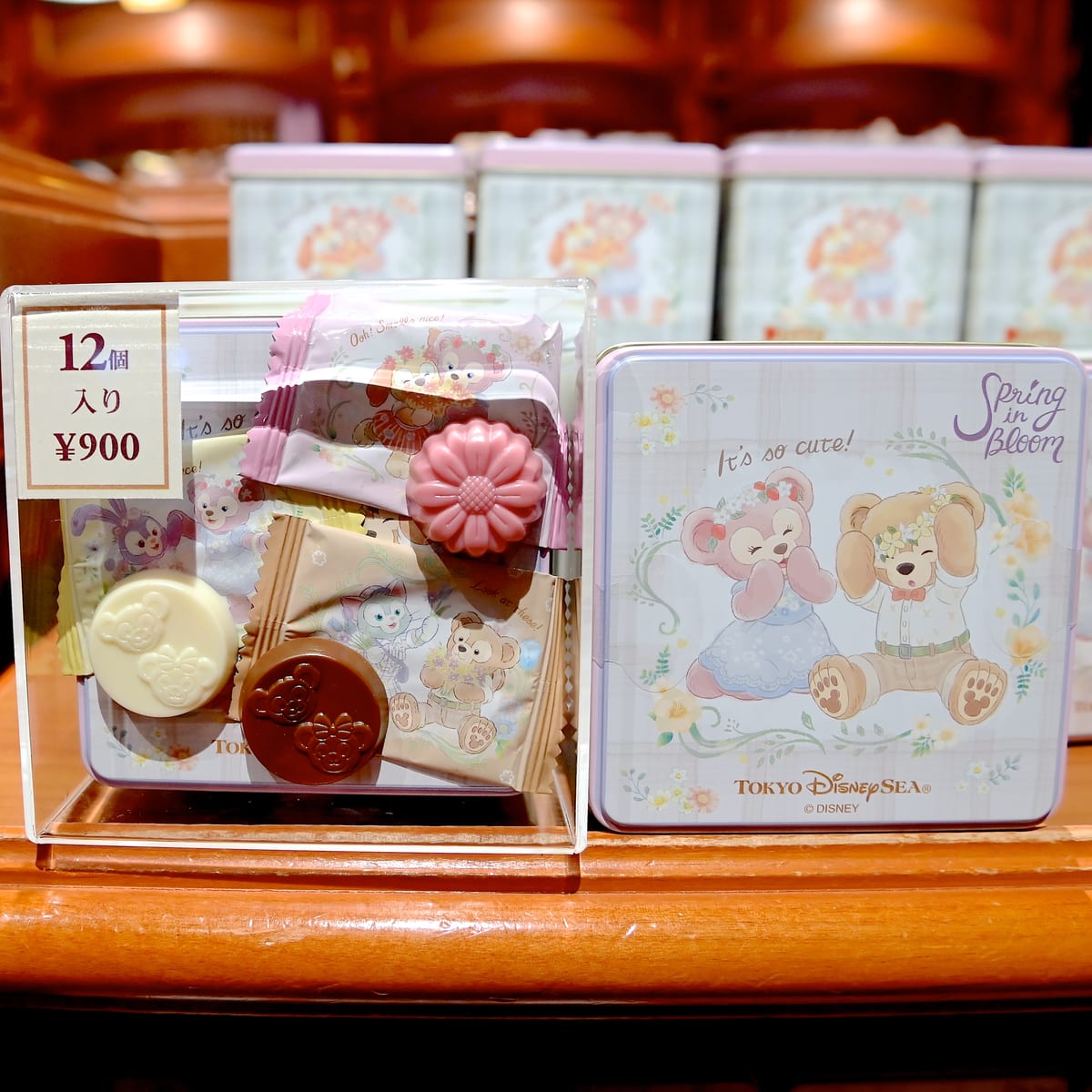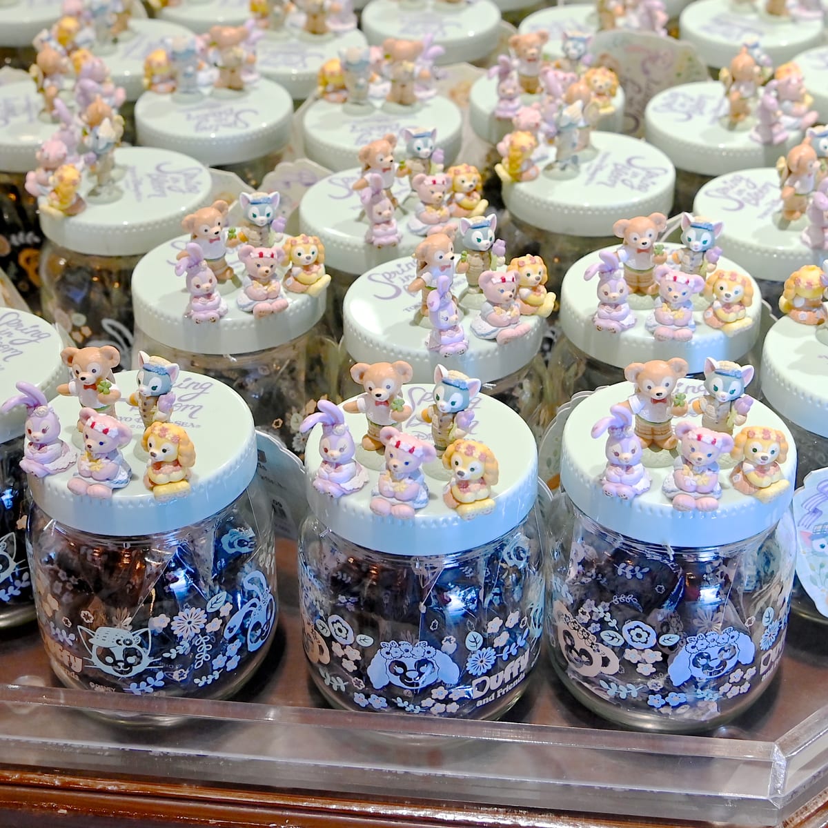 春を満喫するダッフィーたちがちょっこっと立体的にデザインされた缶入りのスウィーツ詰め合わせ。