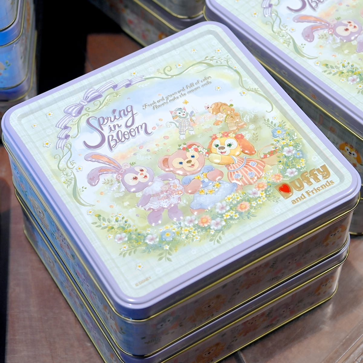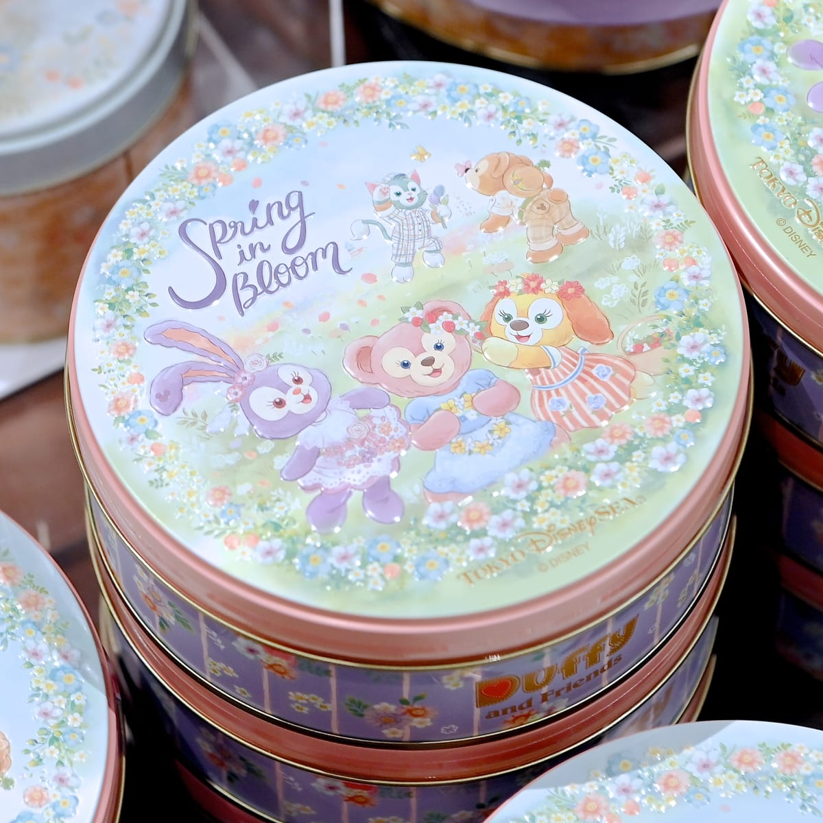 ダッフィー&フレンズのスプリング・イン・ブルームのメインアートが大きくデザインされた缶入りのクッキー。
