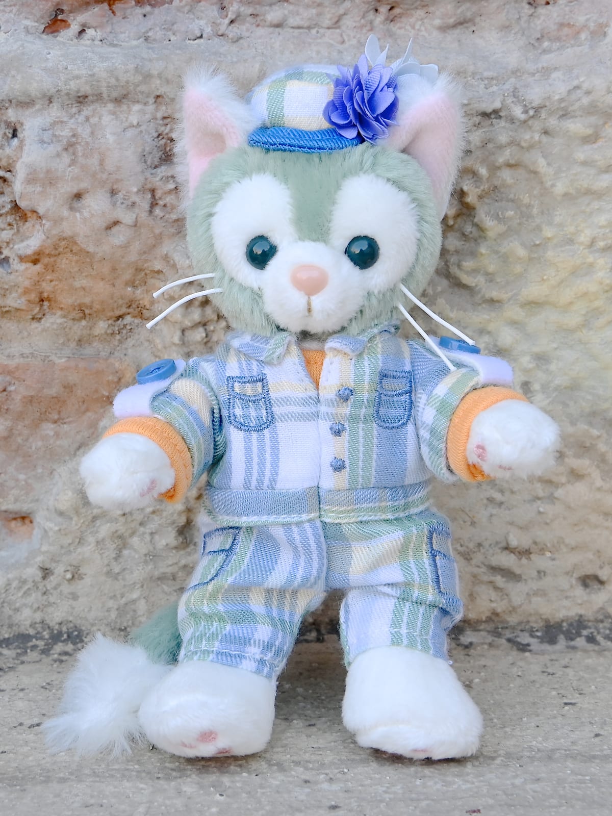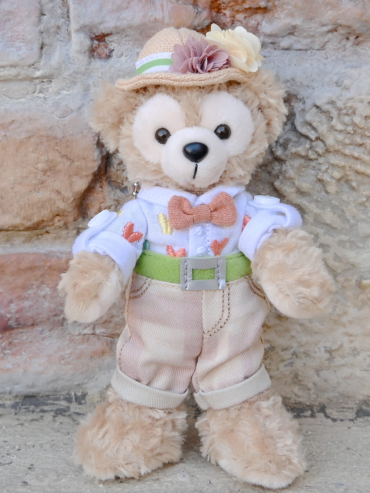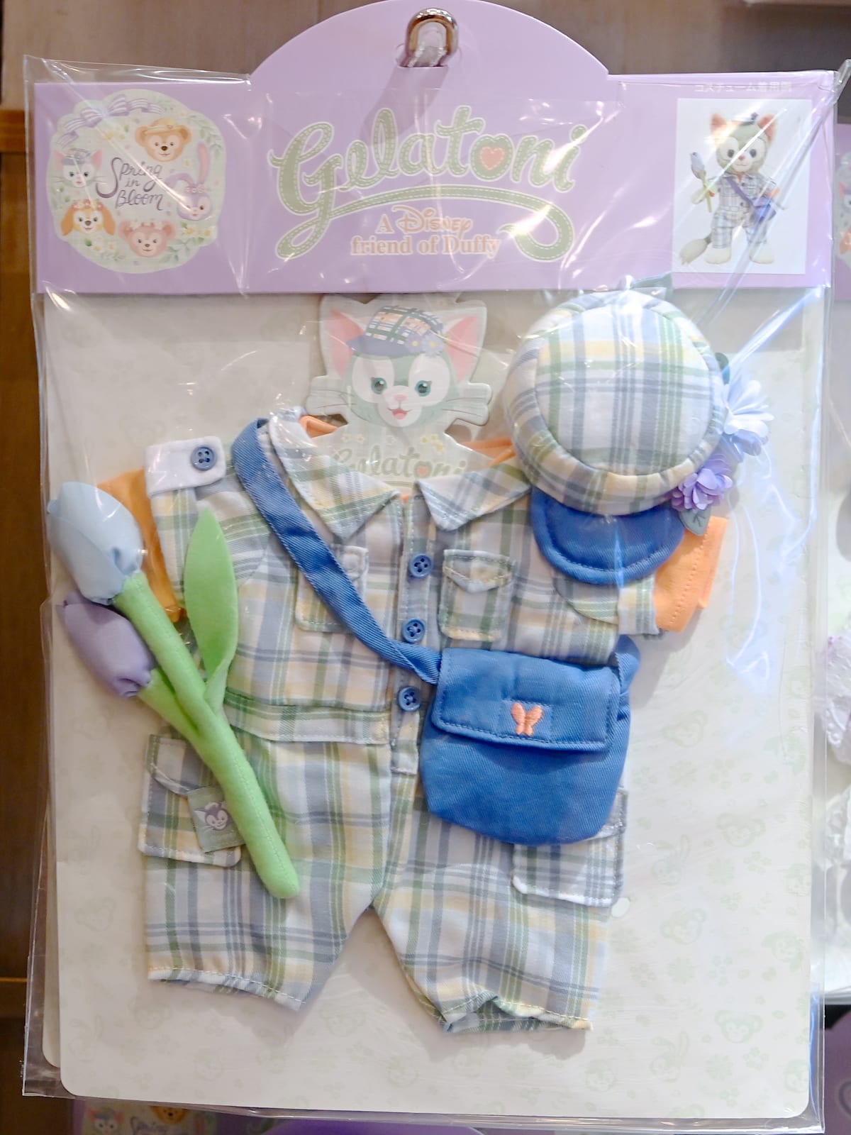ダッフィーは、お花と蝶々付きの帽子、蝶々刺繍入りのシャツ、チェック柄のズボン、水筒のコスチュームセット。