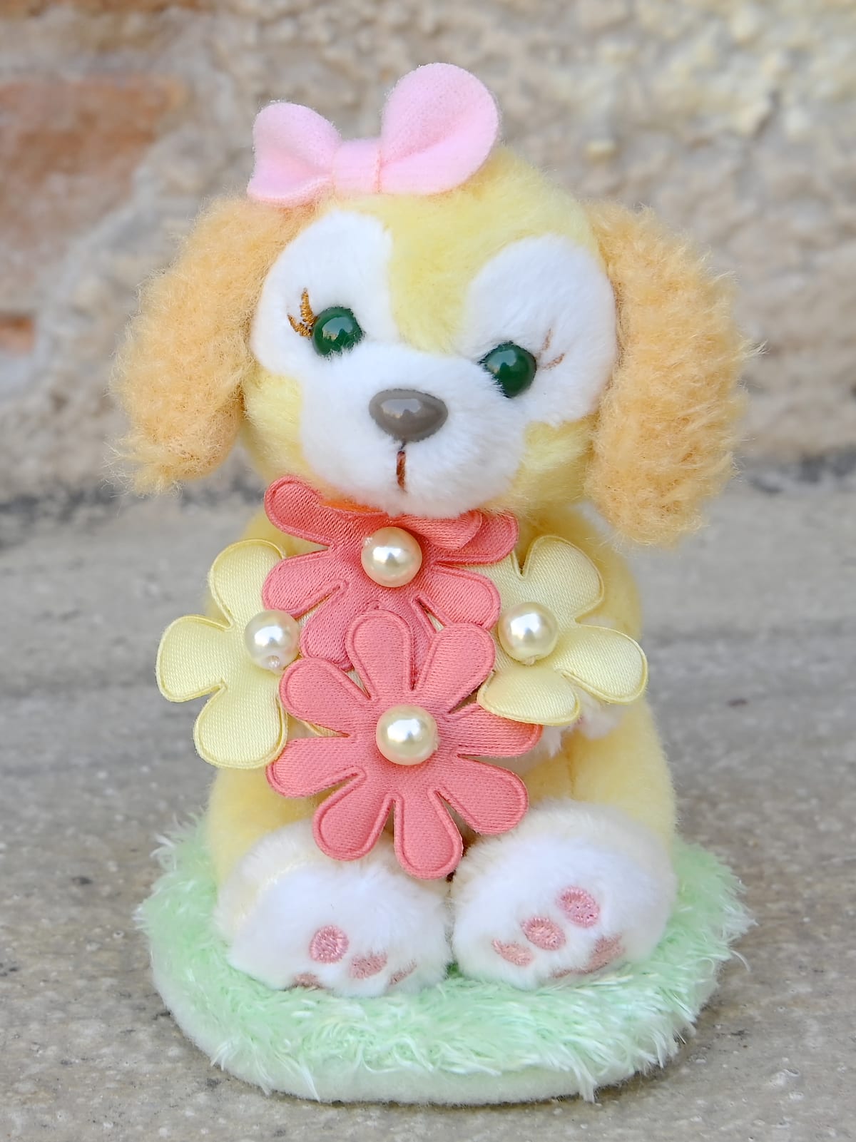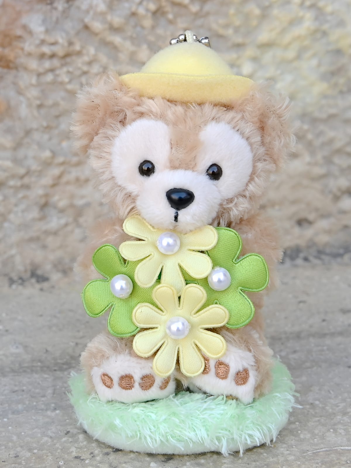イエローとグリーンのお花を持って芝生にすわったダッフィーのぬいぐるみストラップ。
