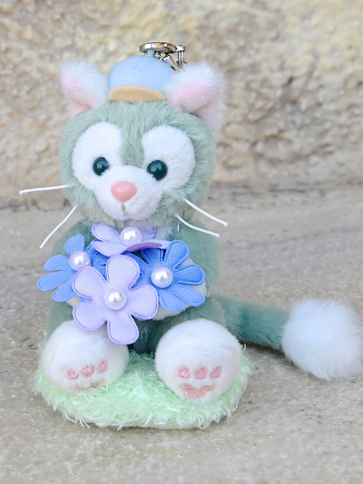 ブルーとパープルのお花を持ったジェラトーニのぬいぐるみストラップ。
