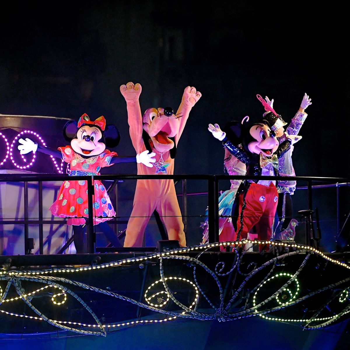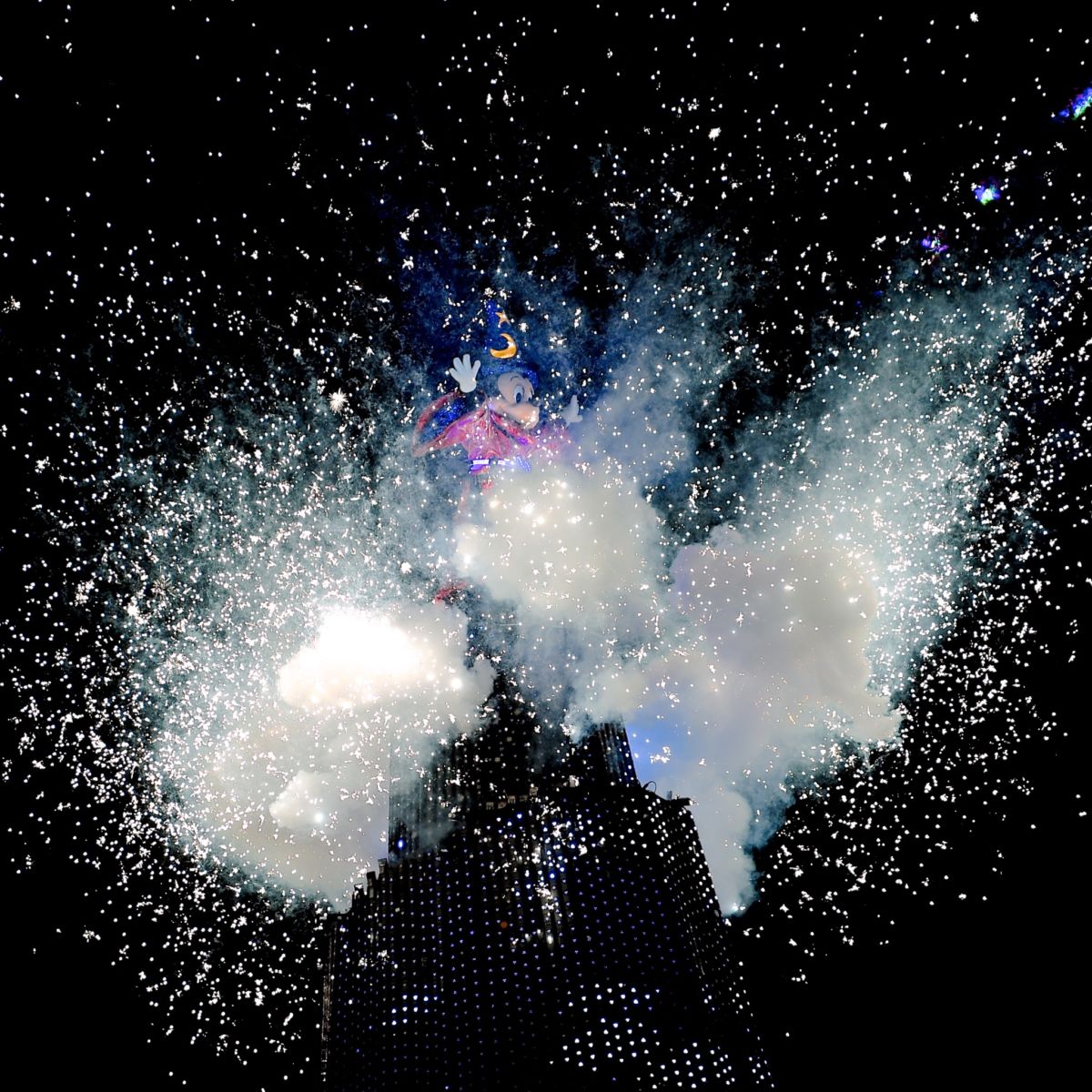 一瞬で大型バージの頂上に現れた光り輝くコスチュームのミッキー。