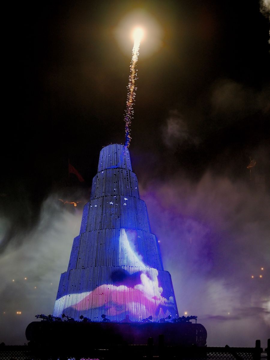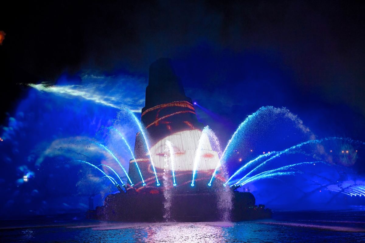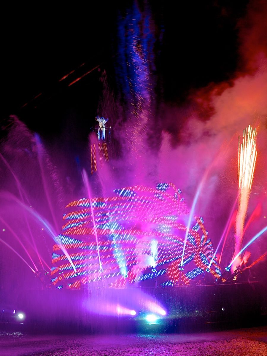水が吹き上がり、パイロが打ち上がります。