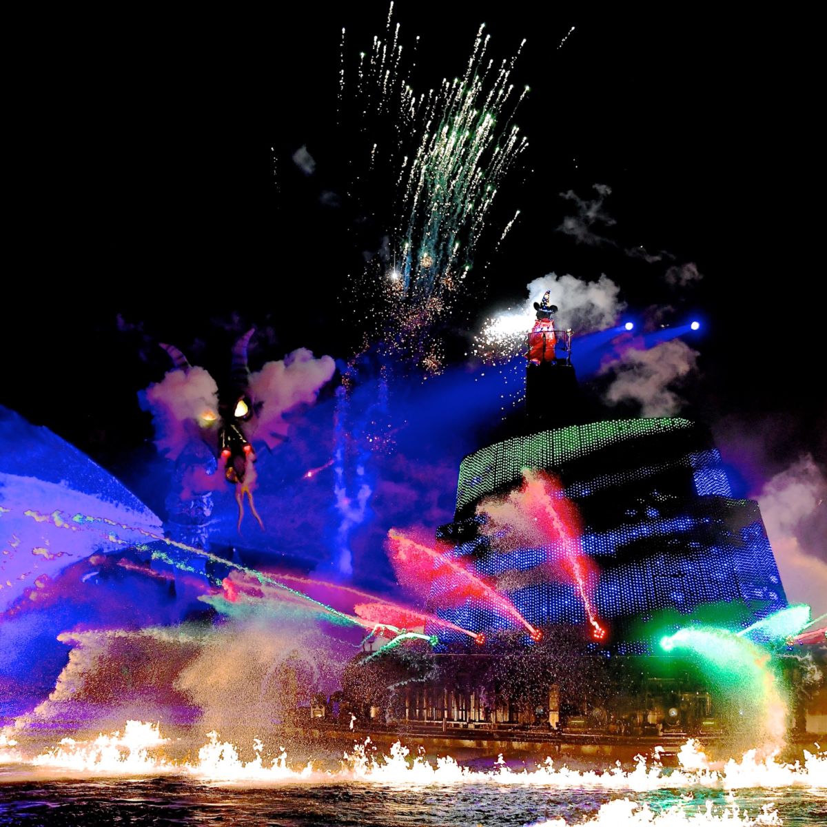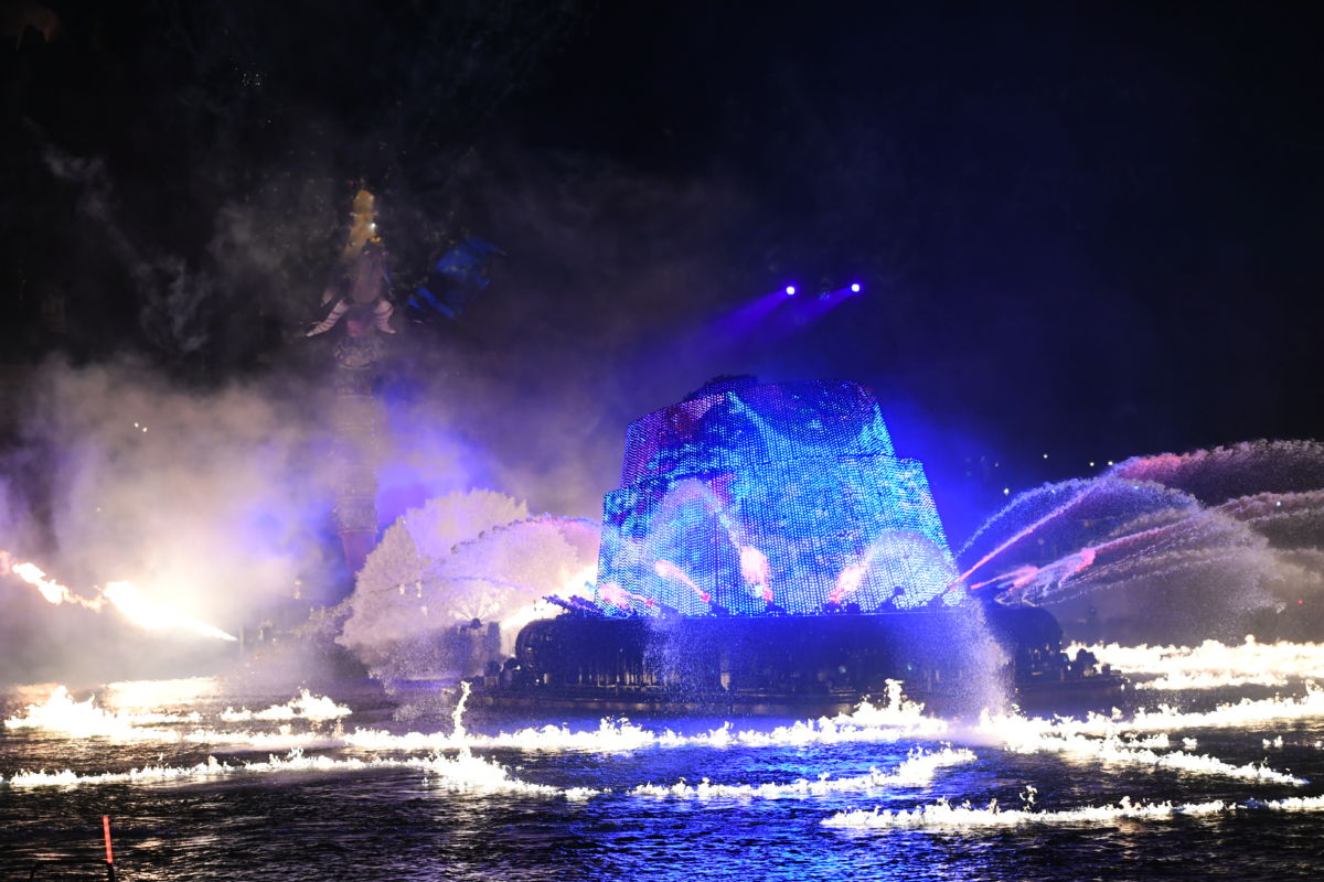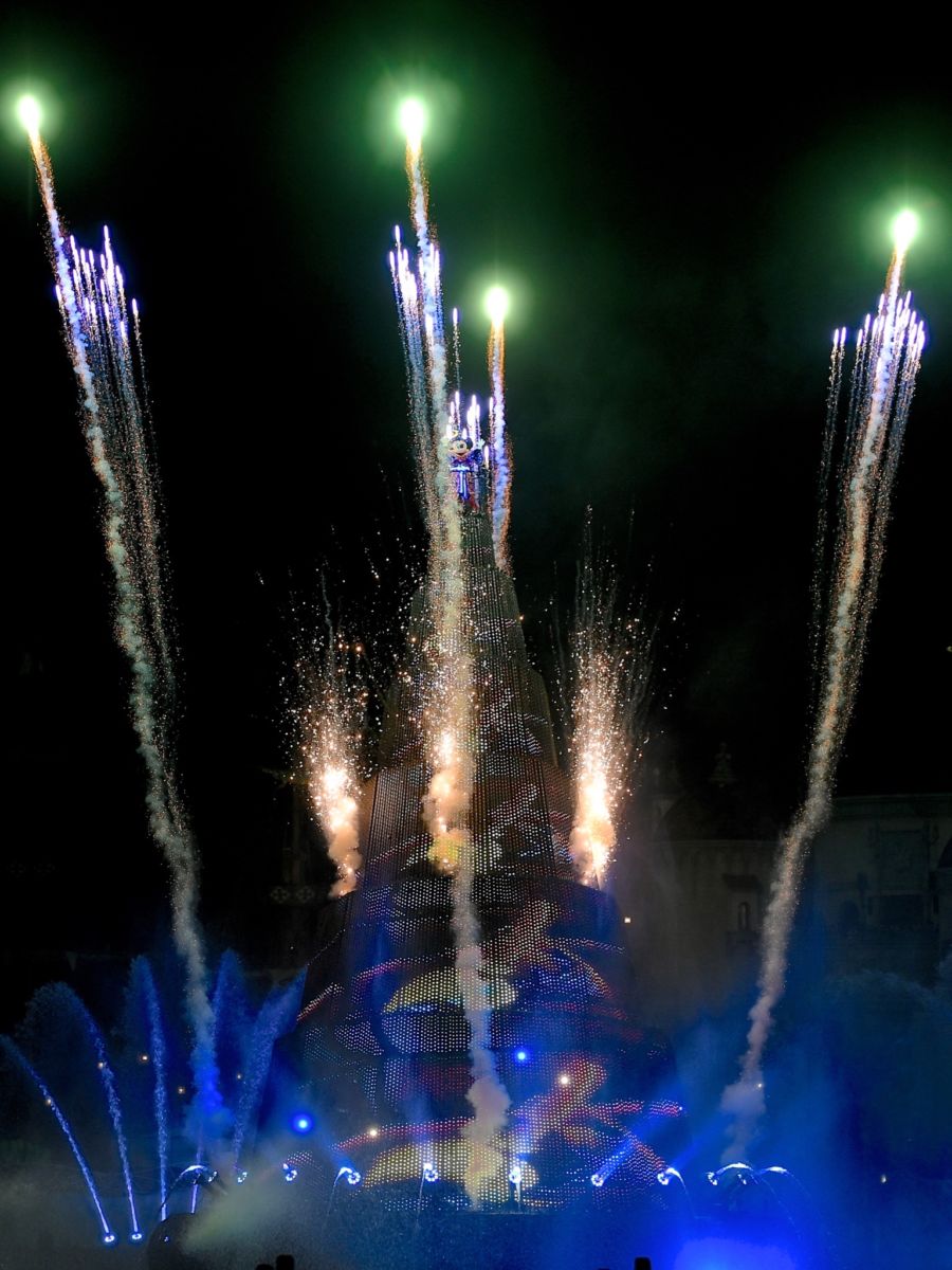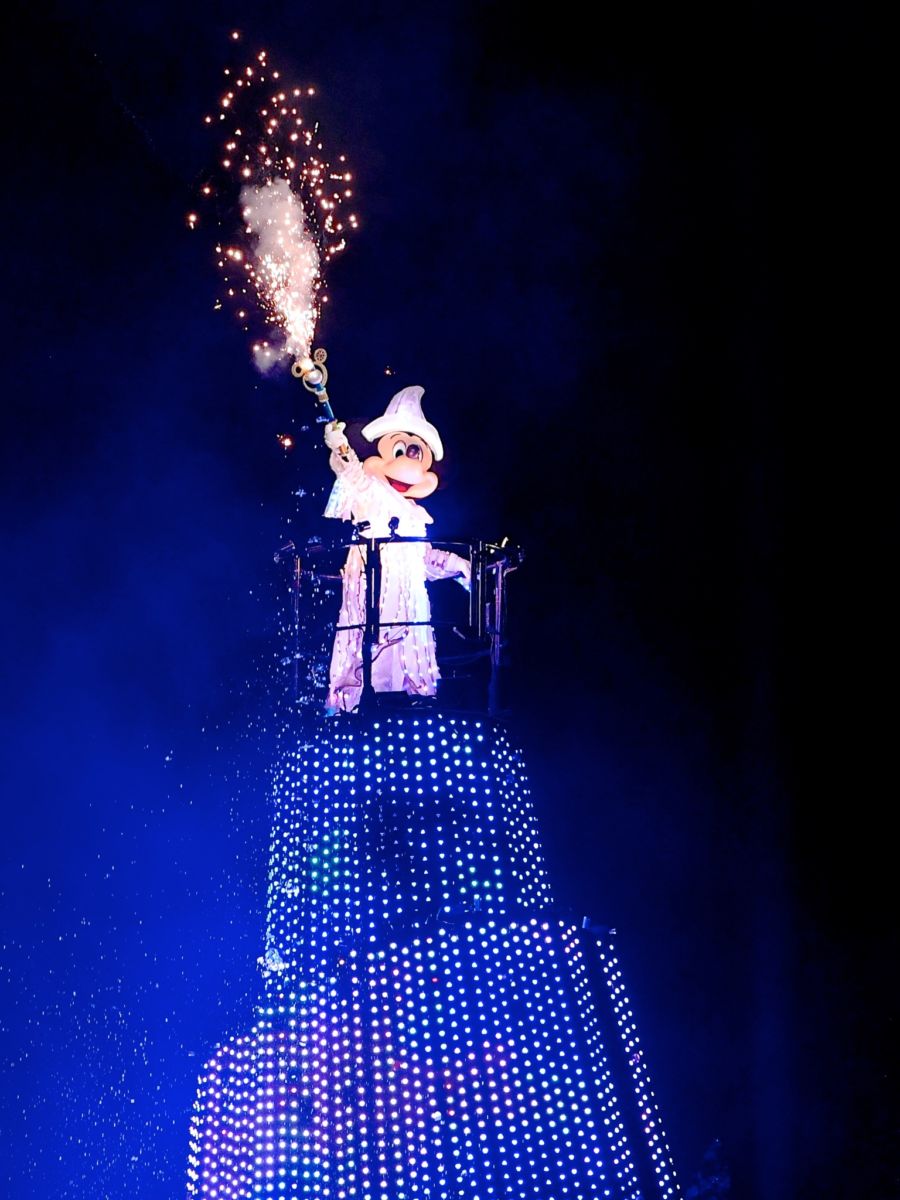 大きなバージ(船)がきらめき、魔法使いの弟子に扮したミッキーがパイロ(花火)とともに登場!