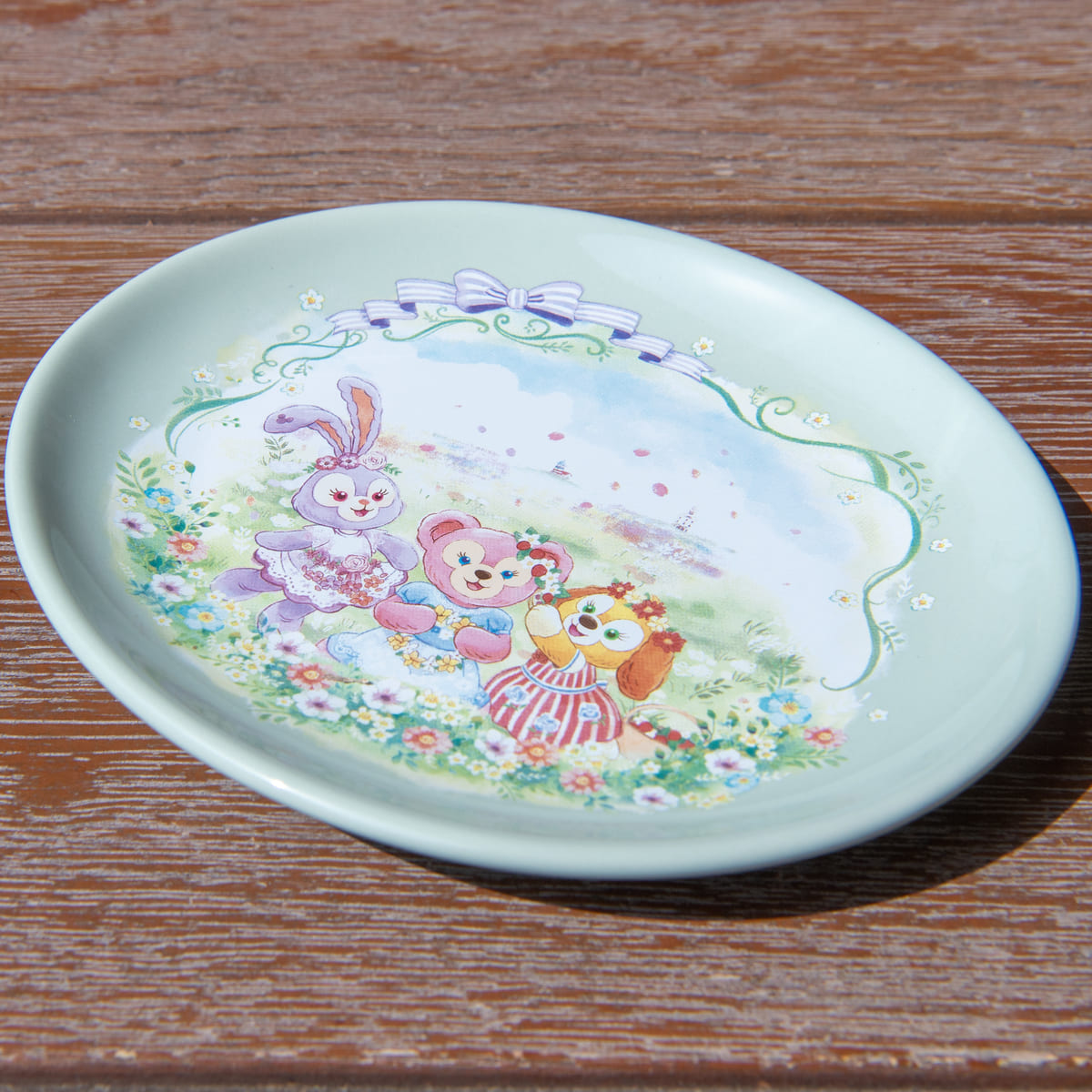スーベニアプレートは、きれいなお花に囲まれながらシェリーメイ、ステラ・ルー、クッキー・アンが、花飾りをつくる様子がデザインされています。