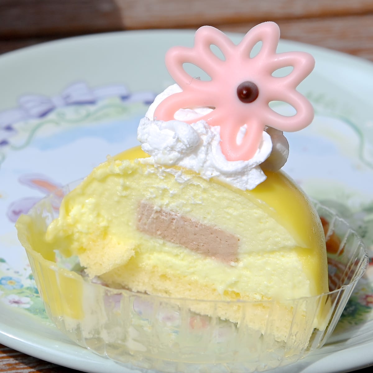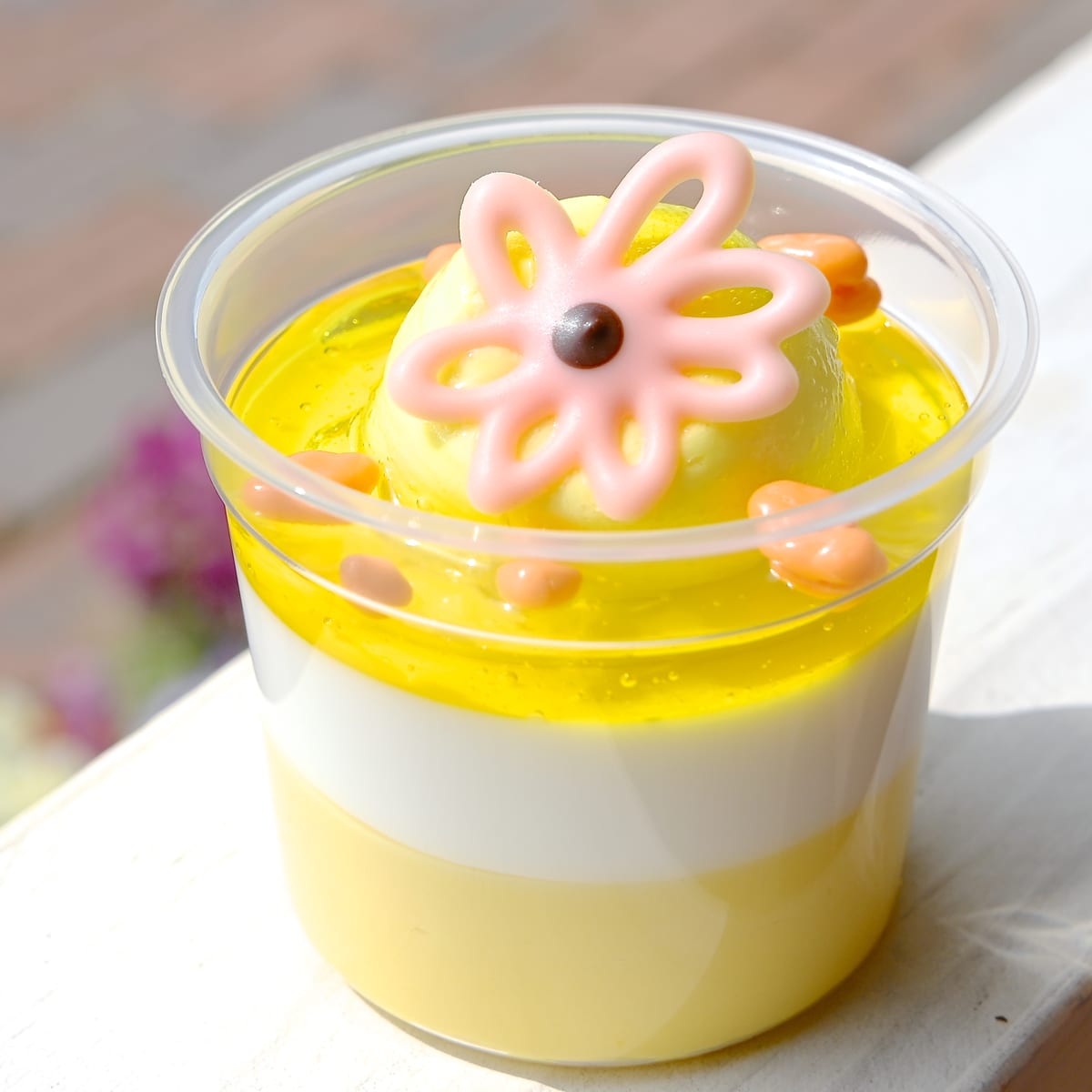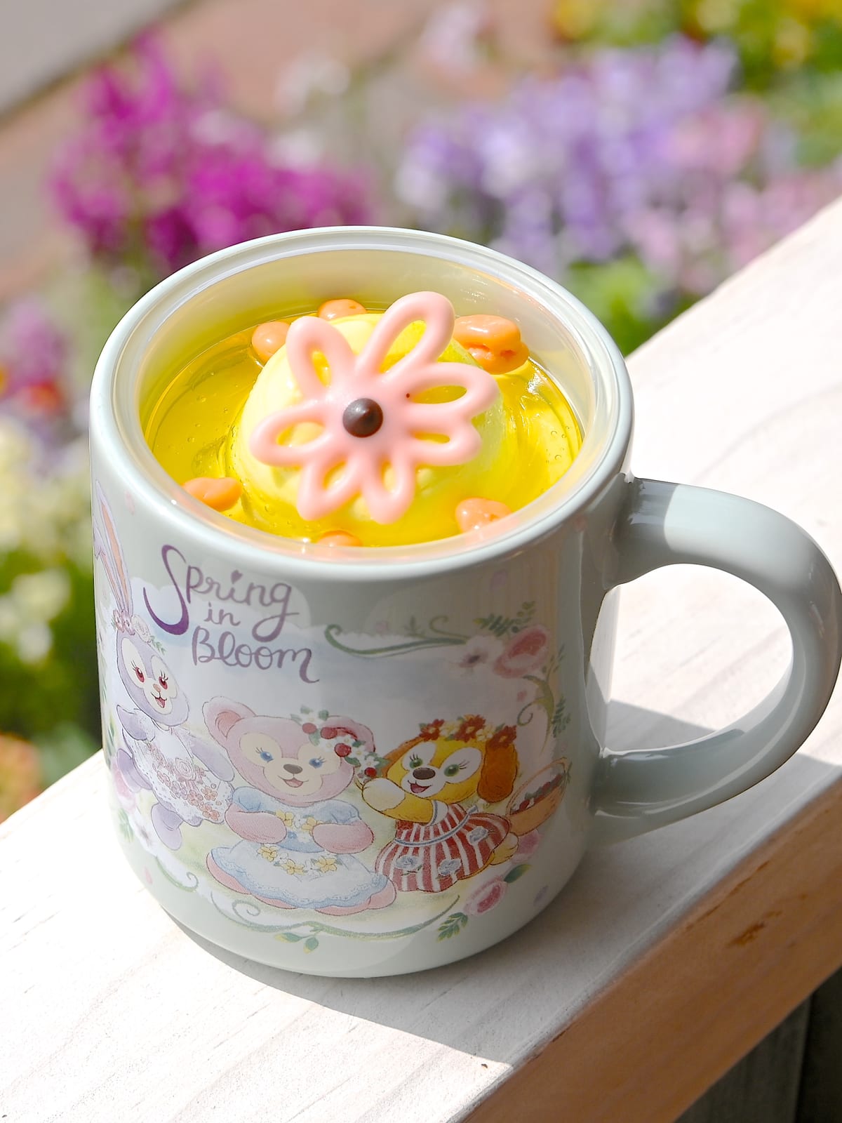 ダッフィーたちがお花畑で春を楽しむ様子がデザインされたスーベニアカップ付きデザート。