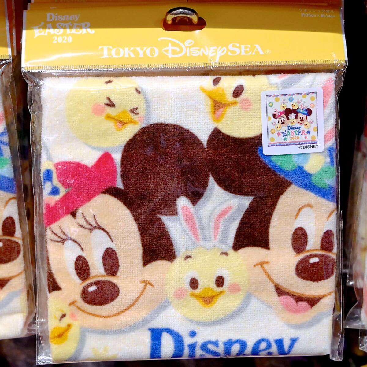“Tip-Topイースター”コスチュームのミッキーマウス、ミニーマウス、うさピヨたちがデザインされたウォッシュタオル。