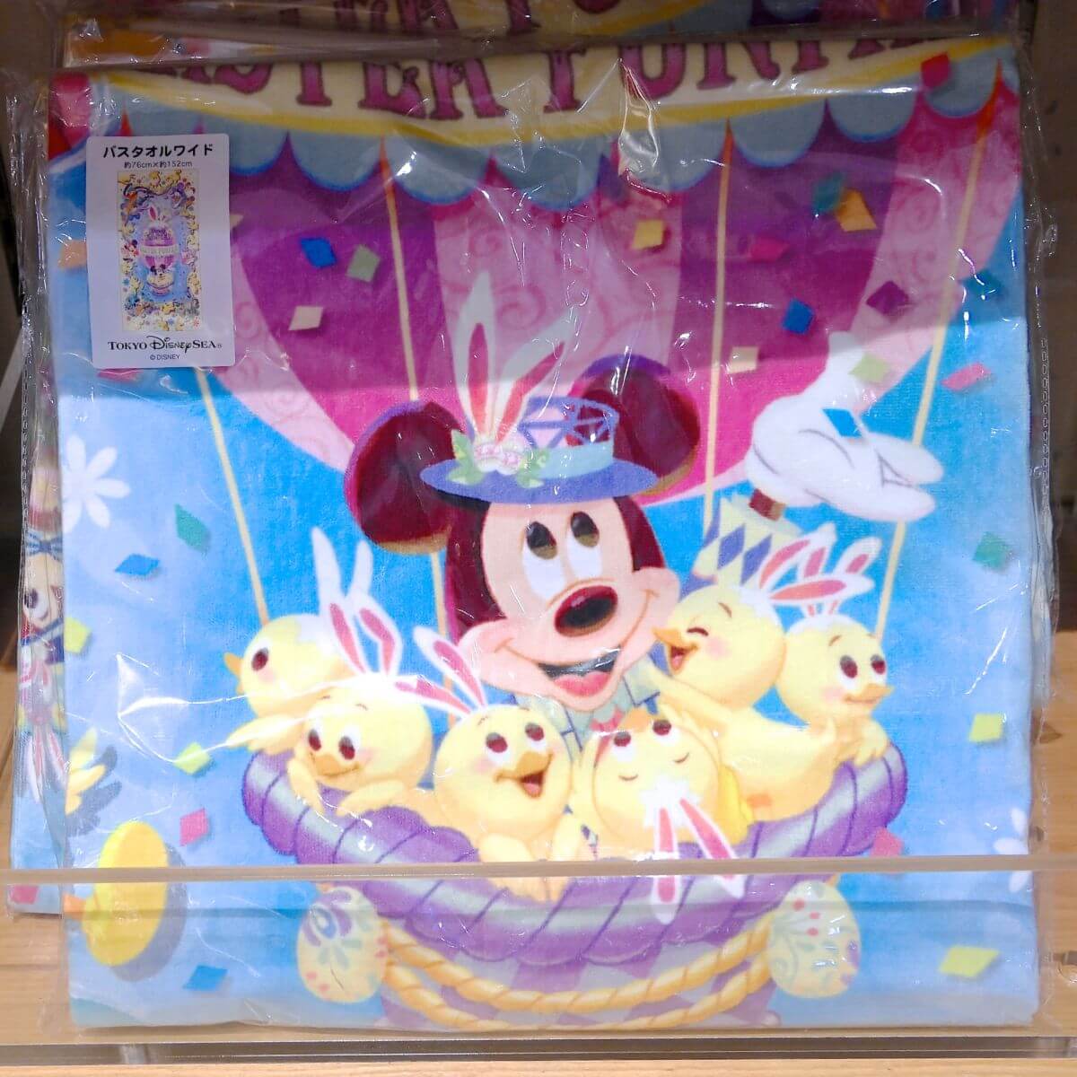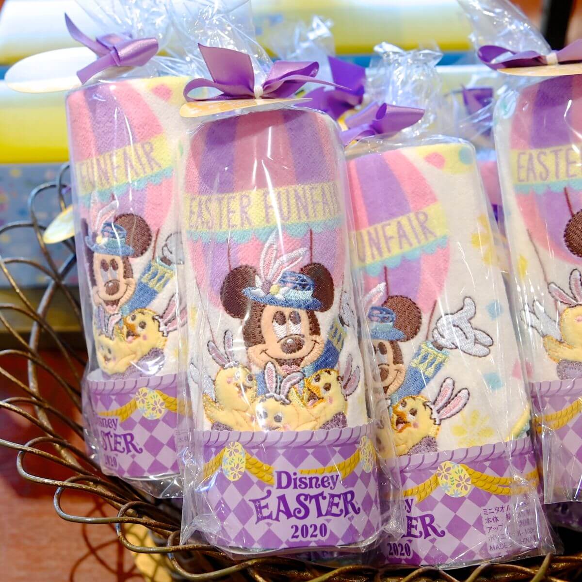 イースターバルーンにのったミッキーマウスとうさピヨ、イースターエッグ、ディズニー・イースター2020のロゴがデザインされたミニタオル。