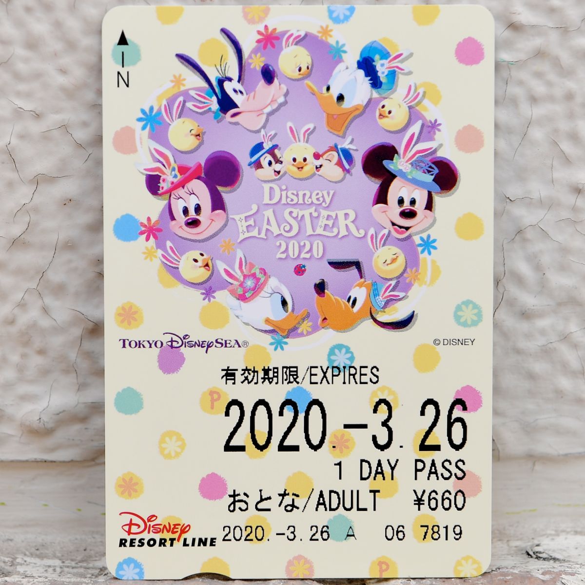 「Tip-Topイースター」コスチュームのミッキーマウスたちとうさピヨたちがデザインされたカラフルなフリーきっぷ。