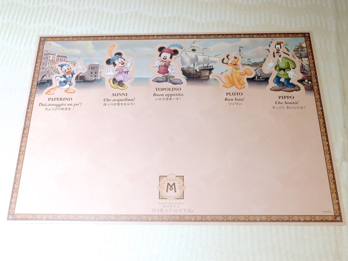 お子様用ランチョンマットには、東京ディズニーシーの風景とイタリア語で書かれたミッキー(TOPOLINO)たちの名前、ちょこっと会話が描かれています☆